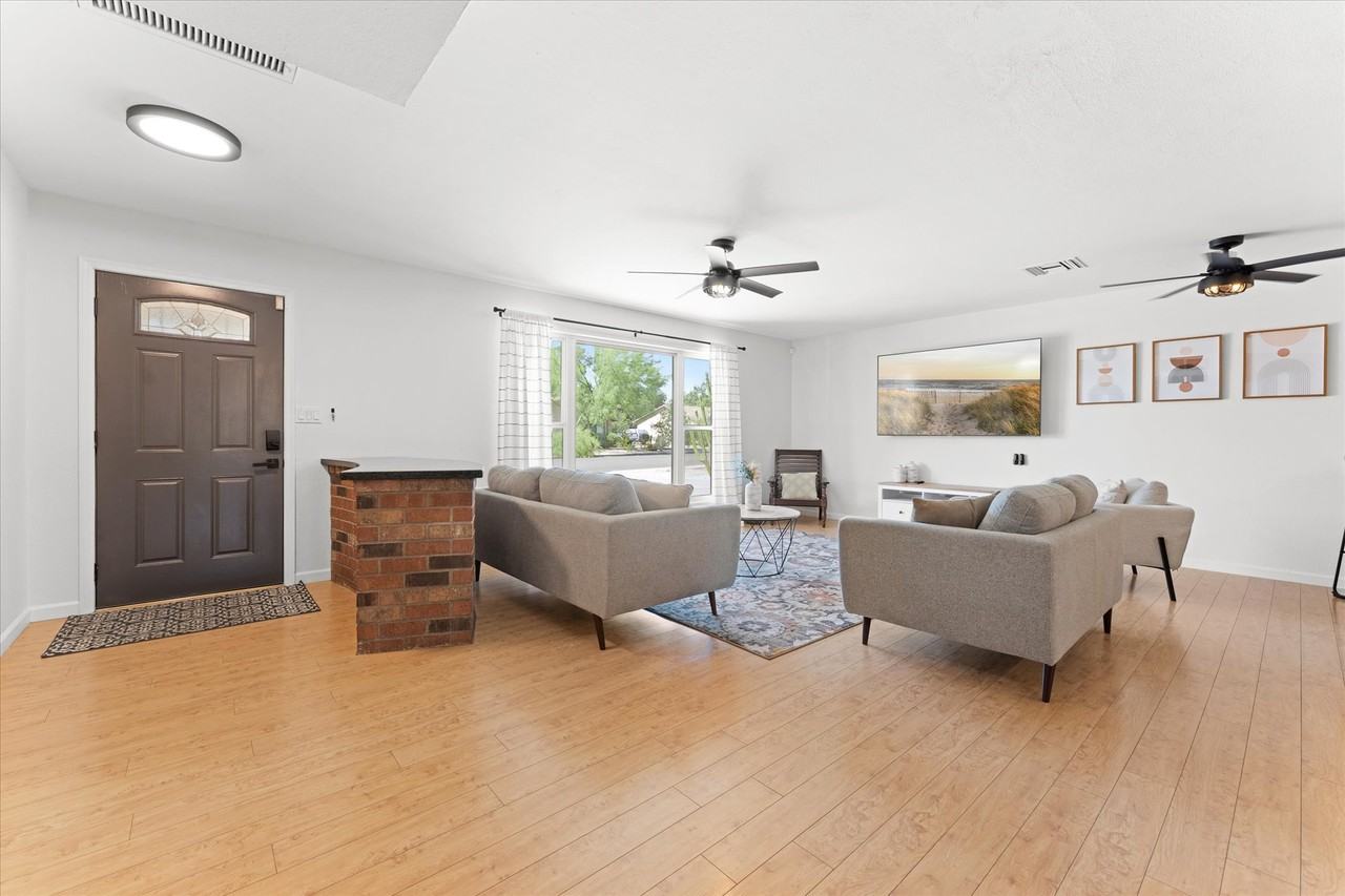 Nestled near the Phoenix Mountains Preserve, this stunning one-story ranch-style home offers five spacious bedrooms and two modern bathrooms. The open-concept layout features a chic farmhouse kitchen with updated appliances, and a large island, perfect for family gatherings and entertaining. Natural light fills the living and dining areas, creating a warm, inviting atmosphere. The master suite includes a walk-in closet and an elegant en-suite bathroom. Situated on a large lot, the backyard is a private oasis with an adobe fireplace, ideal for cozy evenings and outdoor entertainment. The expansive yard offers endless possibilities for gardening or play. Additional features include a two-car garage, energy-efficient windows, and proximity to excellent schools, shopping, and dining.