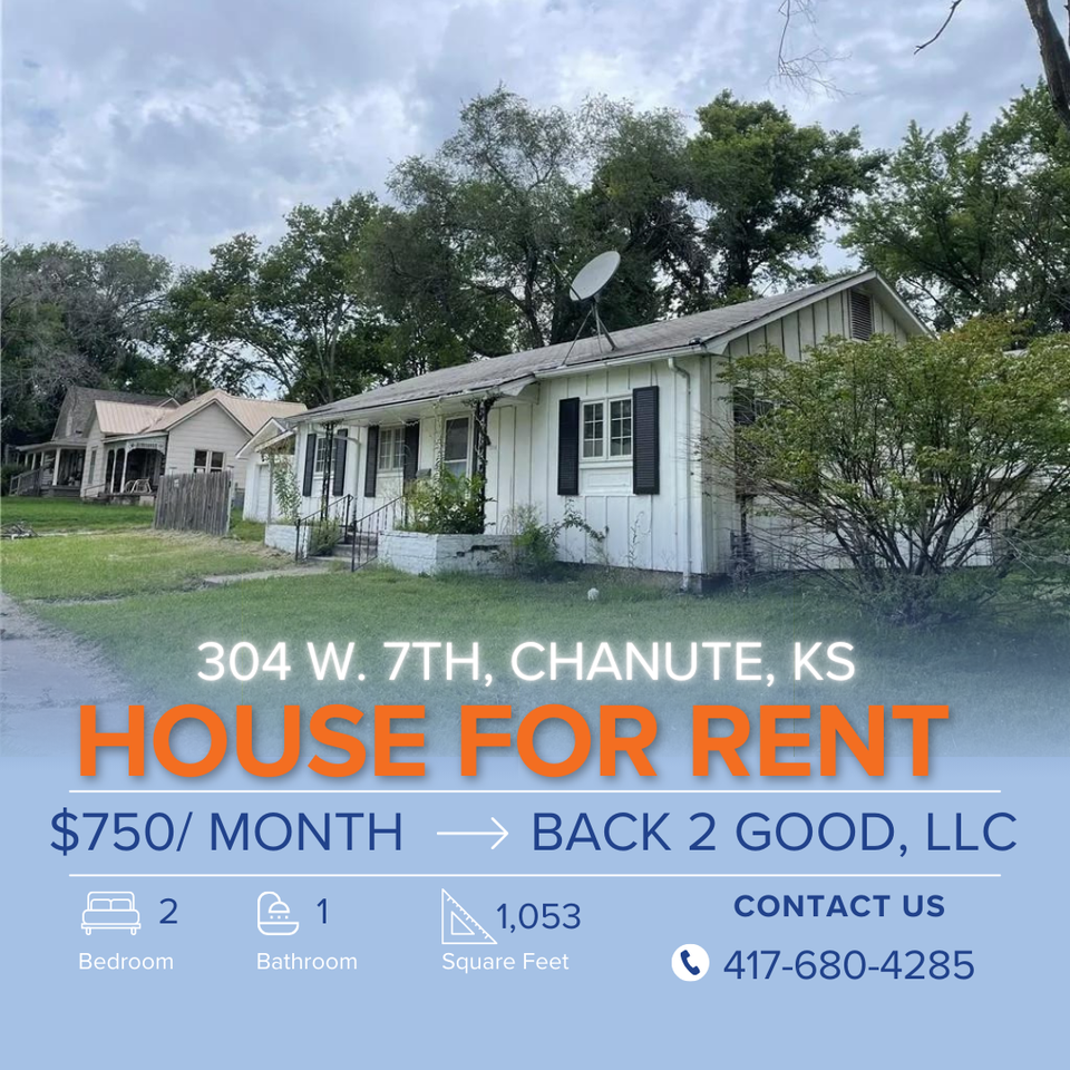 Recently acquired property that we will be looking to lease soon! This 2 bed, 1 bath property has a detached garage, mid-size living room and spacious kitchen area. Contact us at 417-680-4285 for rentals. Contact Dena Daniels at 620-212-3642 for more information on purchasing.