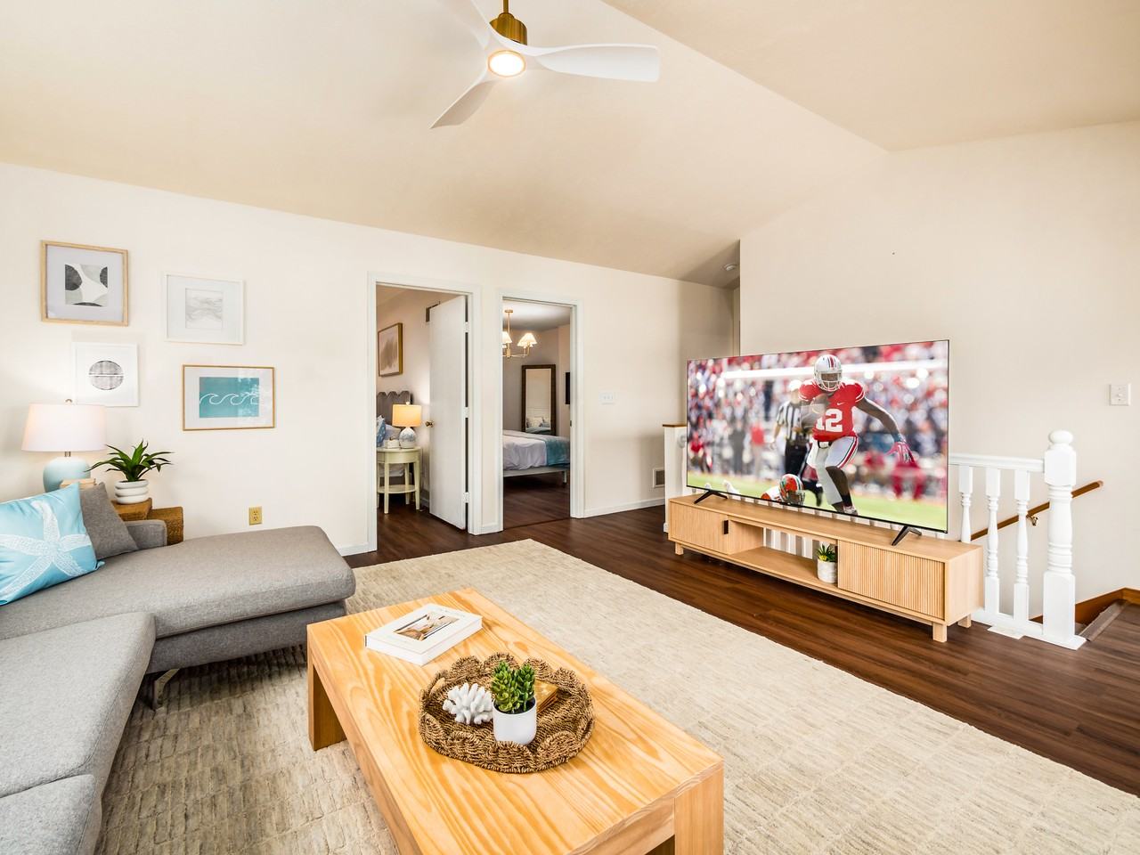 Exclusive modern, custom, Apple Valley Lake Beach House for medium term rent (less than 6 months) during the Fall, Winter, and Spring months. 2 bedrooms + loft and finished basement with living space. 2 and a half bathrooms. Beautiful new wrap around porch with lake views. New custom firepit with seating for 8. Luxury Vinyl Plank flooring throughout. Quartz kitchen countertops. Beach access right next to Davis Beach.