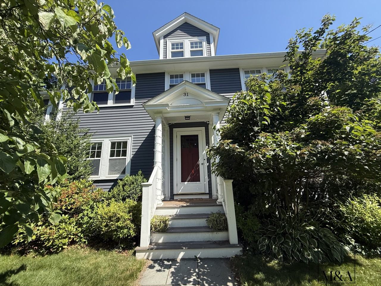 This light-filled, classic center-entrance Colonial is ideally situated on a tranquil, tree-lined street in the heart of Newton Centre. Thoughtfully updated throughout, the home features a completely renovated kitchen and beautifully redone bathrooms. The first floor offers a gracious layout with a formal dining room, living room, den, family room, mudroom, and elegant half bath. French doors from the kitchen and family room lead to a sculpted deck overlooking a lush, fenced-in 10,540 sq. ft. yard with a stone patio—perfect for outdoor entertaining. Upstairs, the second floor features a stunning primary suite with a renovated en-suite bathroom, an additional bedroom with its own en-suite bath, plus two more bedrooms and a full hall bath. The finished lower level provides exceptional flexibility with multiple bonus rooms, including a home office, gym, storage room, and a spacious playroom or media room. A detached two-car garage completes this move-in-ready gem. Just a short walk to Newton Centre, the T, and the newly renovated Bowen Elementary School.