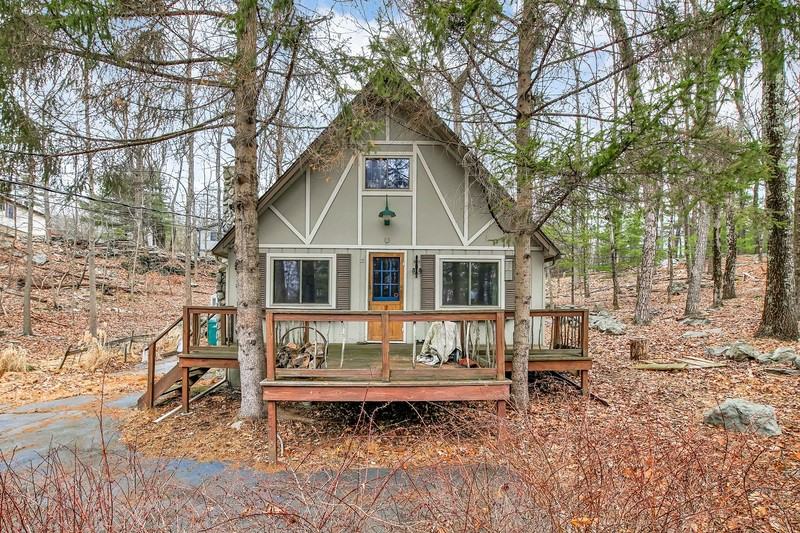 Rustic paradise of scenic tranquility! Feel like you're on vacation every day with this charming 2 bedroom home resting on almost 3 acres of wooded privacy. The home itself features beautiful hardwood floors, fresh neutral paint throughout, and a cathedral ceiling with lovely exposed beams overhead. The main living space offers convenient built-in shelving and a Timberline wood-burning stove with stone hearth, the perfect cost-saving source of heat for those extra chilly nights. In warmer months, relax outdoors on the porch, deck, or the various stone patios that surround the fenced-in garden area, great for growing your own vegetables and herbs. Explore the stone-lined path that meanders throughout the woods and enjoy the sounds of the babbling brook in spring. The small detached, heated studio is ideal space for home office, guest room, or bonus room of your choice! The beautiful community of Wild Acres offers 2 swimming pools, tennis courts, 5 lakes, playground, and a clubhouse. Don't wait! Schedule your showing today before this rare gem disappears!
