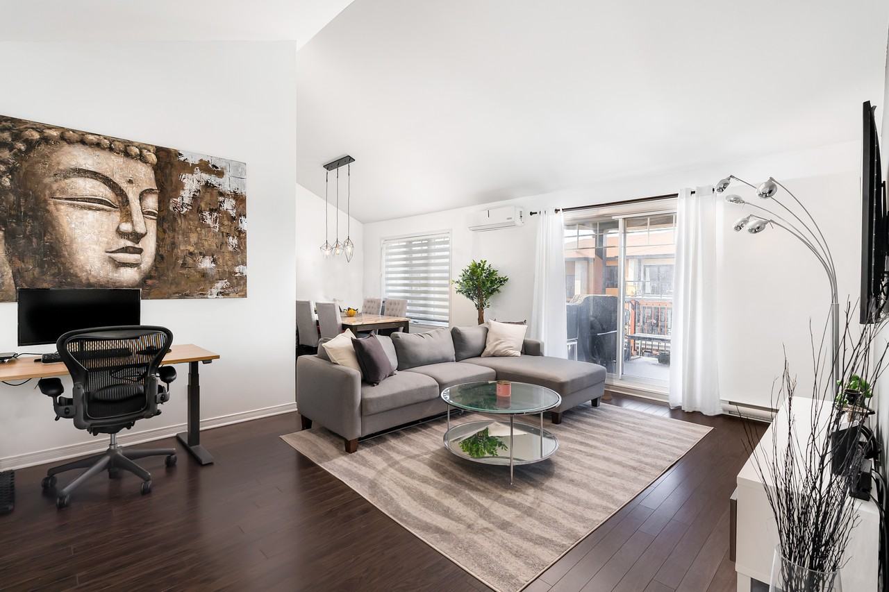 Beautiful open-concept top floor 2 bedroom condo unit. Modern layout and stylish design with large windows and a 12' cathedral ceiling. Large primary bedroom with a spacious walk-in closet, convenient separate laundry room and 1 outdoor parking spot (J302). Ideally located with proximity to the Vaudreuil-Dorion train station, shopping, restaurants, medical and multisports center. Don't delay! Inclusions: Fridge, stove, dishwasher, microwave, washer, dryer, living room tv wall mount, primary bedroom tv and wall mount, light fixtures of a permanent nature, wall mount air conditioner and remote, blinds, curtain rods Exclusions: Curtains, heating, electricity, cable, internet, telephone All Promise to Leases must contain the below: *The Lessee will provide an employment letter, references and a credit check at his expense, satisfactory to the Lessor. *The Lessee will provide proof of insurance coverage for civil liability and personal effects (minimum 2 million dollars) prior to the lease signing and supplied to the Lessor at every renewal. *No smoking of any substance or cultivation of any substance in the private or common portions. *No pets. *No short-term rentals i.e. AirBnB, etc. *The Lessee will abide by the building rules and regulations. *Should the Lessee not renew the lease, he will allow visits with new prospective tenants to start 60 days prior to the lease expiration.