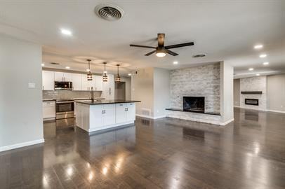 Prepare to be captivated as you step into this stunning ranch-style home, meticulously remodeled in 2021. Upon entering, you'll be greeted by the warm rich hardwood flooring. The spacious layout boasts oversized living spaces, two charming fireplaces, and a media room. The kitchen is culinary haven and showcases quartz countertops, ample storage, and a sprawling island. Soft close drawers, farmhouse sink, and pendant lights add a touch of elegance, while the glass top range and built-in microwave offer modern convenience. For those seeking versatile living, this home has it. Just off the kitchen, you'll find a separate section of the house that is perfect for an in-law suite or a guest retreat. Complete with its own living area, bathroom, and direct access to the backyard, this space offers privacy and comfort for your loved ones. Every bathroom has been tastefully redesigned with 2021 finishes. With its meticulously remodeled interior, this property truly stands out from the rest.