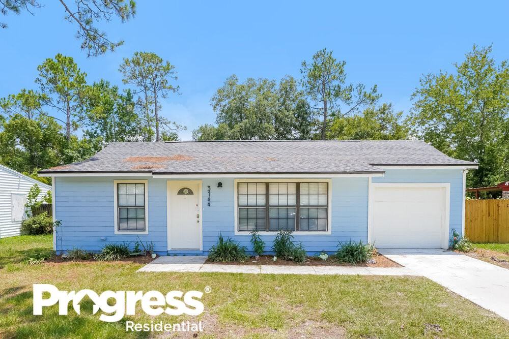 This home is priced to rent and won't be around for long. Apply now, while the current residents are preparing to move out, or call to arrange a meeting with your local Progress Residential leasing specialist today. This home features Progress Smart Home - Progress Residential’s smart home app, which allows you to control the home securely from any of your devices. Learn more at rentprogress com smarthome Sporting a distinctive sea-blue exterior, this Jacksonville, FL rental home with two bathrooms and three bedrooms is close to Cormorant Branch and a variety of great restaurants. Featuring a fenced-in backyard with a cement patio, this charming house offers over 1,450 square feet of premium living space. Step into a living room with vinyl plank flooring, blinded windows overlooking the front of the home, and high ceilings with excellent ventilation. Continue past the living room into a bright kitchen with large dome lights, granite countertops, a double-door refrigerator, and white cabinets with bar handles. Plush carpeting, a collection of closets, and dual vanity sinks in the attached bathroom put the finishing touches on the master bedroom. Call before time runs out to tour this Jacksonville home!