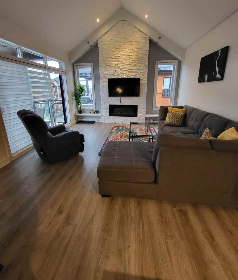 Version française ci-dessous Virtual visit link (video) available This new and stylish condo is close to every service and amenity; a 5 minute walk to the Vaudreuil train station, across from multiple outlets, near a Walmart, Reno Depot, Metro, sports facility, shopping, restaurants, etc. Even the new super hospital will only be 5 minutes away by car. Built in 2016, and on the top floor of the building(3 floors - no elevator), this 2 bedroom, 1,270 ft2 condo has a lot to offer. The ceilings are 9 feet high throughout the condo with large windows along the outer perimeter and there is a 14 foot cathedral ceiling in the living room with a white rock wall accent that naturally brings your eye to the full height of the room. Spacious and modern, it is a must see! Comes with a 28”x47” storage locker (on the same floor as the unit – 4th floor), an 11 x 12 foot balcony and an outdoor parking space (second parking spot is available). The condo comes with stainless steel fridge, stove, microwave & dishwasher. There is also washer and dryer and air-conditioning in the condo. Free access to the terrace, swimming pool. There is also a gym in the complex. Lease Terms: 12 months Available September 1, 2022 Excluded: electricity, cable, internet, tenant insurance Conditions: non-smoker, non-air-B&B, proof of renter's liability insurance ------------------------------------------------------------------------------------------------------ Visite virtuelle disponible(video) Ce nouveau condo chic est près de tous les services et commodités; 5 minutes à pied de la gare de train Vaudreuil, en face de plusieurs magasins, près d’un Walmart, Réno Dépôt, supermarché Métro, center sportif, restaurent, etc. Le nouveau super hôpital sera à 5 minutes en voiture une fois construit. Construit en 2016, et sur l’étage supérieur de l’immeuble (3 étages - sans ascenseur), ce condo à 2 chambres à coucher de 1,270 pi2 a beaucoup à vous offrir. Les plafonds font 9 pieds de haut à travers le condo, il y a de la grande fenestration sur le périmètre extérieur et il y a un plafond cathédrale de 14 pieds dans le salon avec un mur d’accent en pierre qui porte naturellement l’œil à voir la pleine hauteur de la pièce. Spacieux et moderne, c’est à voir ! Vient avec un espace de rangement de 28x47pouces (à l’étage – 4e), un balcon de 11 x 12 pieds et un espace de stationnement extérieur (une deuxième place de parking est disponible). Le condo inclus un réfrigérateur, une cuisinière, un microonde, un lave-vaisselle tous en en acier inoxydables. Il y a aussi laveuse et sécheuse et un unité A/C inclus dans le condo. Accès gratuit à la terrasse et à la piscine extérieure, ainsi qu'au gym. Termes du bail: 12 mois Disponible Septembre 1, 2022 Exclus coûts de: électricité, câble, internet, assurance locataire Conditions: non-fumeur, non-air-B&B, preuve de l'assurance