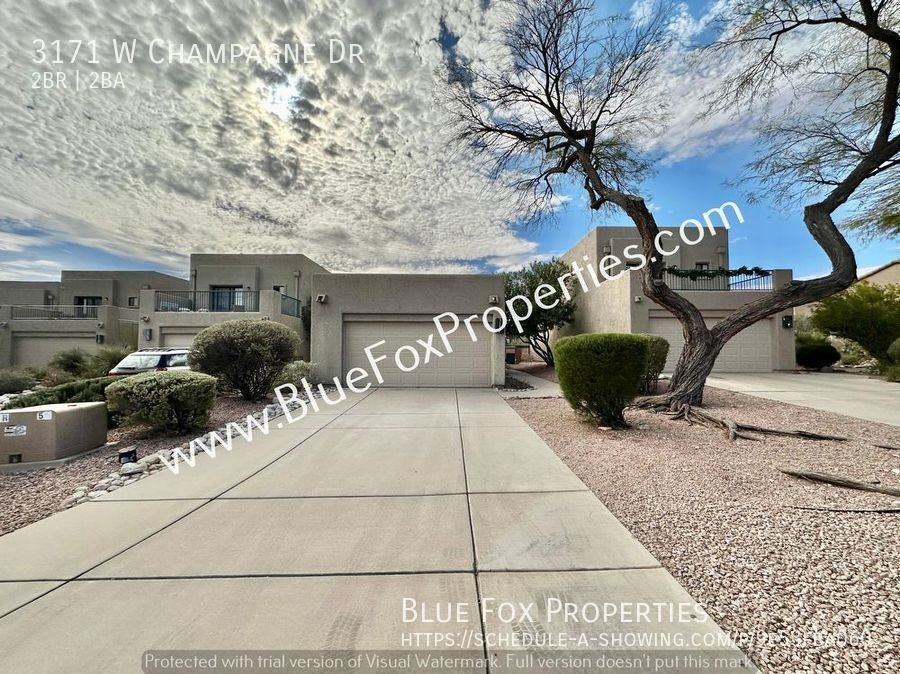 Gorgeous 2 bedroom, 2 bathroom home in the Champagne Homeowners Community! An inviting entrance leads you into a bright and spacious living room with vaulting ceilings. You will love the great room that lets natural light flow effortlessly from room to room. The kitchen is an entertainers' heaven with sleek appliances, beautiful countertops, and plenty of space to create the next meal! Enjoy the primary bedroom that features an en suite bathroom with a dual vanity! Relax in the mountain view backyard! Community pool and spa. Great location with easy access to local golf courses, Tucson Mountain Park, dining, and more! The house has both cooling and heating systems combined in one unit. There are two Oleander plants on the property, which are toxic if ingested by humans or pets, please beware. This home is available now for a 1-year lease. The rental rate is $1,600.00 per month, and the security deposit is $2,400.00. Blue Fox Properties is an Equal Opportunity Housing provider. We are also licensed REALTORS.