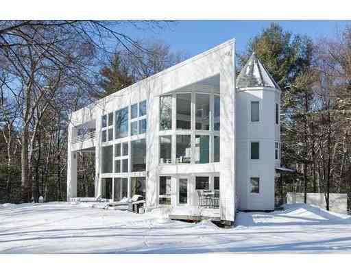 The inspired architecture of this fascinating contemporary is pure sculpture and is perfectly suited to its woodland setting. Its 3-story triangular floor plan features a totally open family room bookended by an open kitchen on one end and formal dining and living rooms on the other. Poised above these vast rooms are 2 floors with 3 bedrooms, 2 baths, an office and an exercise rm. With sweeping views to the south, the massive glass facade takes full advantage of the sun's warmth during the cold winter months. Walls of glass frame a lovely backdrop of woodland views while outriding terraces, porches, and decks create a seamless flow inside to out. This spacious, airy and energy-efficient home is beautifully sited on over 4 private acres and is located near the conveniences of Carlisle, Acton, and Concord Centers.