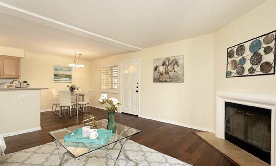 This spacious single-level end-unit condo in La Costa Alta features an open floor plan designed for comfortable living. Beautiful hardwood floors and a charming corner fireplace create a warm and inviting atmosphere. The kitchen is equipped with stainless steel appliances, gas cooking, and low-maintenance quartz countertops, making it both functional and stylish. The generously sized bedroom includes a walk-in closet, while an additional closet houses the washer and dryer along with extra space for linens and storage. The home also features newer dual-pane windows complemented by wood shutters for added efficiency and style. A separate on-site storage room, approximately 3' x 6', provides ample space for seasonal items, bikes, or recreational gear. Enjoy relaxing on the private covered patio, which backs to open space and includes a utility closet for additional storage. Residents have access to community amenities such as a pool, spa, fitness center, and clubhouse. Conveniently located near shopping, dining, recreation, schools, and the beach, this pet-friendly home offers both comfort and convenience.