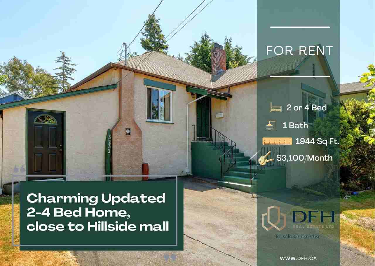 We are thrilled to announce that we have a new property available to rent! Perfect for Uvic or Camosan students looking for shared accommodation. The property has 2 bedrooms and a large living room that could be a bedroom and converted garage which is fully heated as another bedroom giving a 4 bed home. Situated close to the Hillside shopping mall, this home is in a quiet neighborhood and comes with new kitchen appliances, new flooring throughout and a large storage area downstairs with new washer and dryer. Large, private garden, perfect for having picnics or BBQ during the warm summer months. Get in touch with us today for a viewing before this property gets snapped up in no time! *No Pets* 1 Year Lease $3,400 Utilities to be paid by renters. DFH REAL ESTATE LTD.