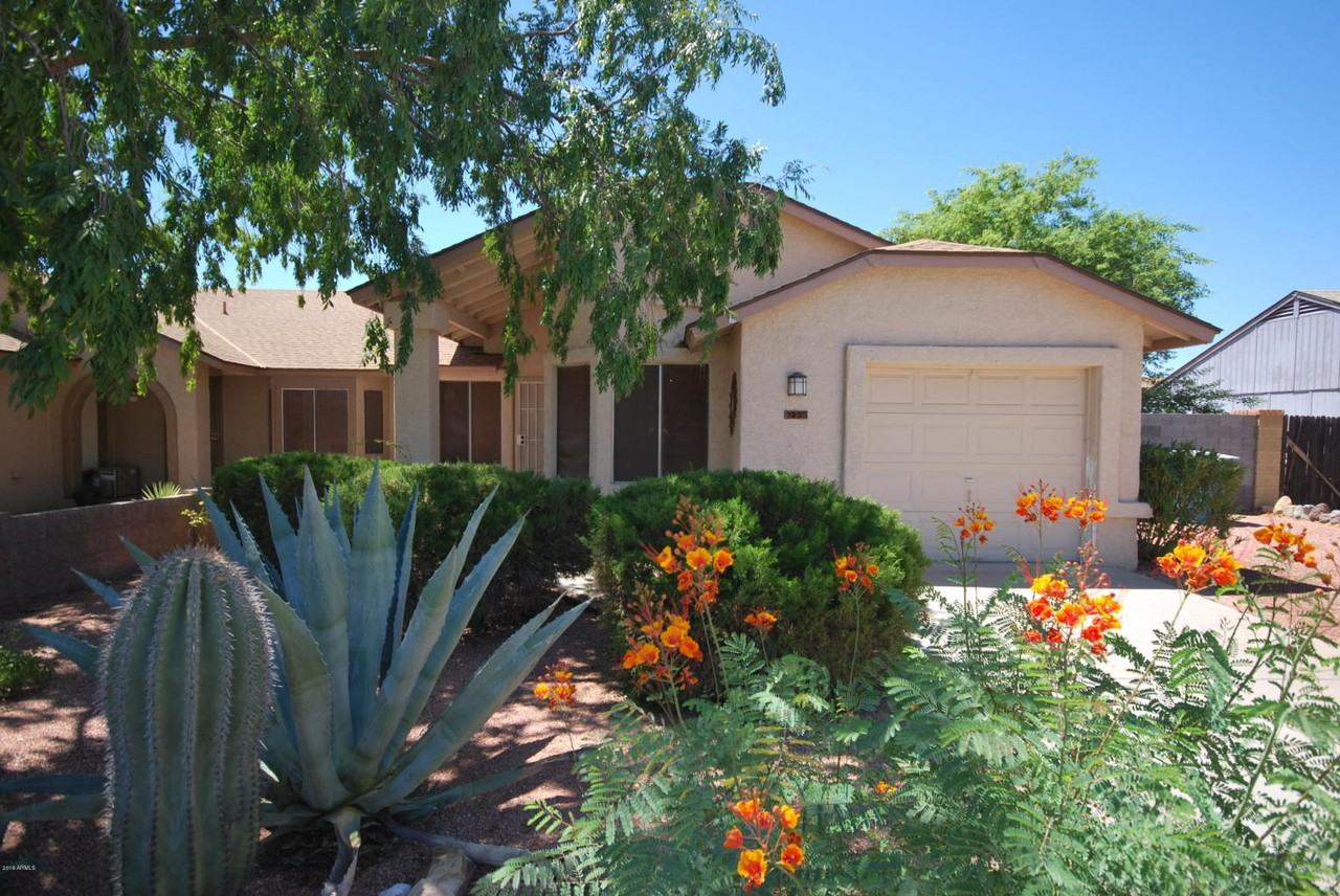 RECENTLY PAINTED HOME WITH PRIVATE BACKYARD SWIMMING POOL! Tile through out living areas and master bedroom, laminate flooring in second bedroom and carpet in third bedroom. Open kitchen with breakfast bar has plenty of natural lighting from the large Arcadia doors that look out to the backyard. This spacious area can act as a eat in kitchen and family room area. Spacious master bedroom with master bath that includes double sinks and walk in closet. The backyard boasts a beautiful fenced in pool and a covered patio making it ideal for entertaining. Quick and easy access to the 101 and I-17. Avail for move in ASAP