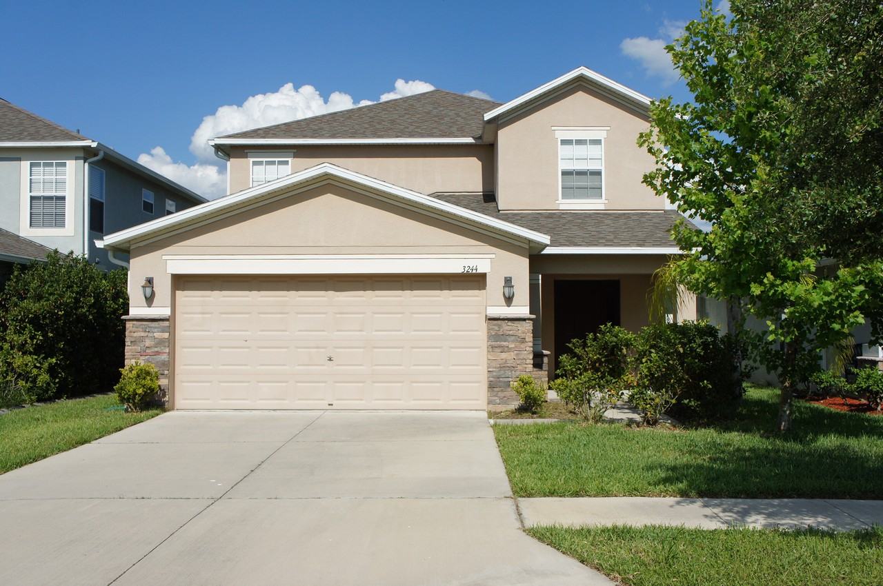 Lovely 5 bedroom 2.5 bath home in the gorgeous community of Concord Station. Neighborhood is central to shopping, great schools, and both the Suncoast Parkway and I-75. Home features open living/dining room combo and large kitchen with eating area that opens up to covered porch. Master suite downstairs with 4 additional bedrooms upstairs with bonus loft. Yard is privacy fenced and overlooks small pond. Community features basketball and tennis courts, swimming pool, fitness center, park and clubhouse/community center.