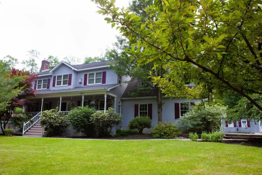 Enjoy the amenities of this AWARD WINNING BACKYARD.Your own private resort! Stunning, Award winning home featured in Flair Magazine and WINNER of Pocono Landscape of the Year and Waterfall design. The photos tell the whole story of this meticulous home...4 BR, 5 Baths, 2 Master Suites, Gourmet Indoor and Outdoor Kitchen/bar, Full Finished Lower Level with Pub Bar and Entertainment Center, whole home wired with surround sound. Breathtaking outside features include over 2500 sq ft of entertaining space; gardens, salt water in-ground pool, 30 ft waterfall, Wood burning FP, wrap around porch, covered kitchen/bar with refrig, ice maker, grills and detached garage and stunning hardscapes.