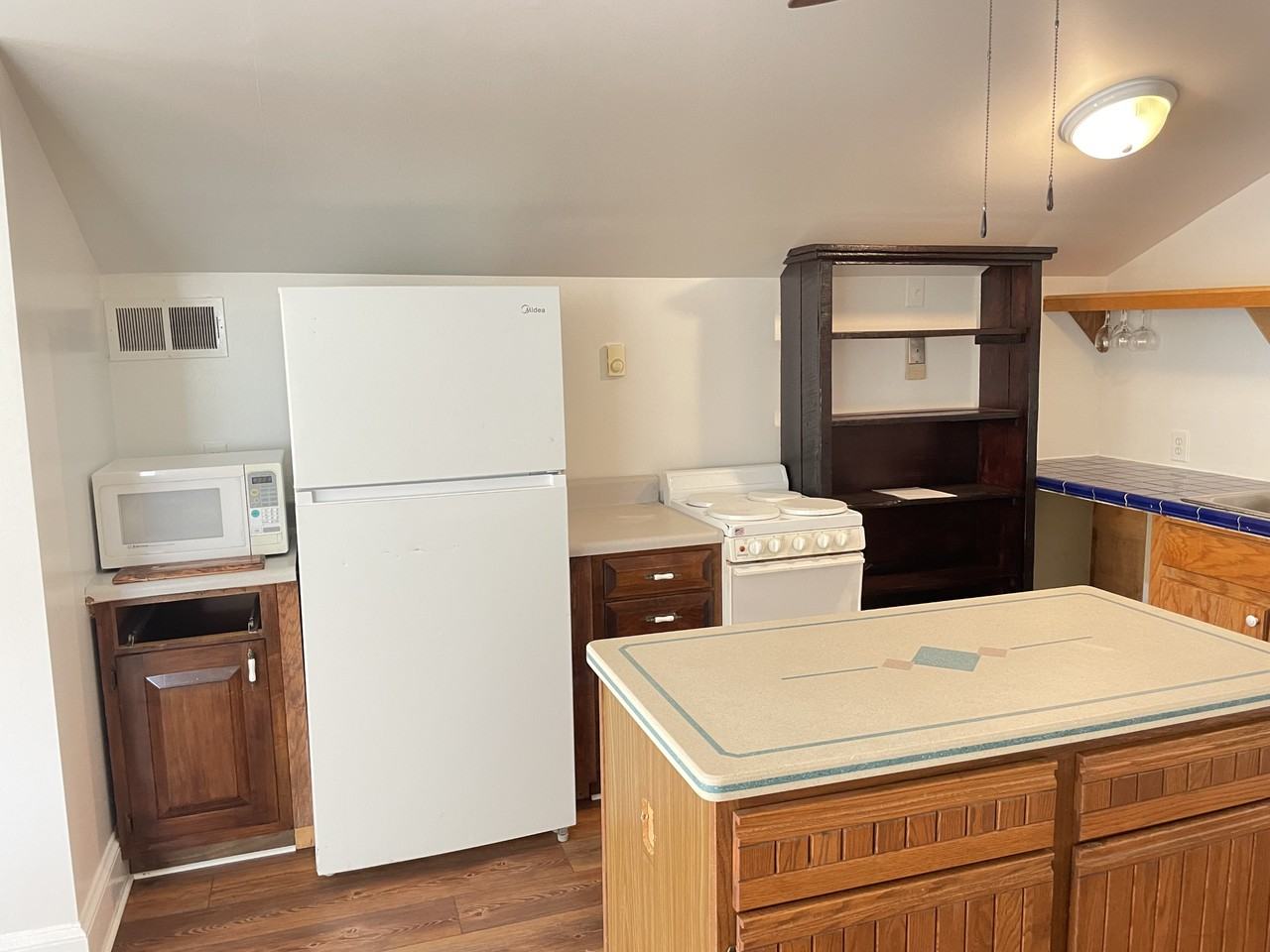 Now Available Furnished: Brand new floors, entire apartment and entrance professionally cleaned and repainted. Offered for your consideration: A one bedroom open floor plan studio apartment located on a private farm in a quiet neighborhood. Apartment is on top of a large 11 stall horse barn. Fully furnished, new brown vinyl plank floors. Apartment has full sized kitchen, cobalt tile counter. Kitchen is stocked with dishes and supplies, custom plywood cabinets, large wooden food and dish storage shelves, and food prep island with extra storage space underneath. Included furnished: Queen sized bed, round wood table with chairs, medium sized couch and chair and one medium dresser. Brand new furniture cushions, rugs, bedding, ceiling fans and bathroom amenities. Medium sized bathroom with clawfoot tub/shower. Community washer and dryer located downstairs. Baseboard heat and window unit a/c. Long interior foyer (freshly painted) with stairs to access apartment. Clean and ready to rent. Available as a mid to long term rental. No smokers. No pets allowed. For ONE person only. Farm is located in Luray, VA on 56 acres. 10 minutes from both Luray and Stanley VA. Apartment available for $1,000 a month (utilities:$200)