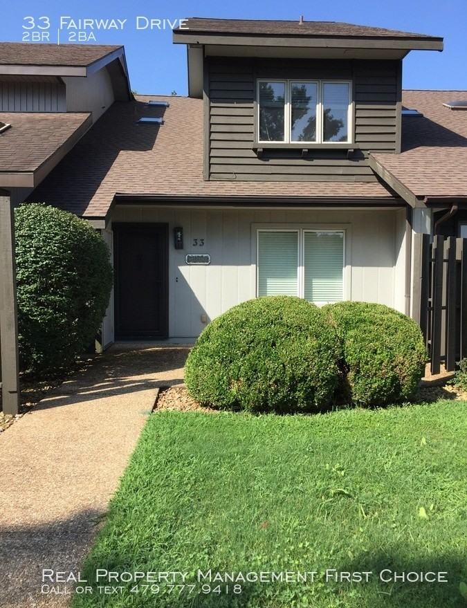 33 Fairway Drive in Bella Vista is offered for rent by Real Property Management First Choice. This lovely town home has 2 stories and is situated between two beautiful golf holes with plenty of surrounding trees and open area. It features an open kitchen - family room downstairs and 2 bedrooms and a bonus room upstairs. The laundry room is off two bedrooms. The kitchen and family room have wood-grain tile. The bedrooms are carpeted. Two car garage entered through the back driveway. It is also walking distance to the Metfield Clubhouse. Unit has been freshly painted, and new flooring thru out. Call Teresa to schedule your appointment now 479.582.9310. Rent: $1000 Deposit: $1000 Application Fee: $55 per application