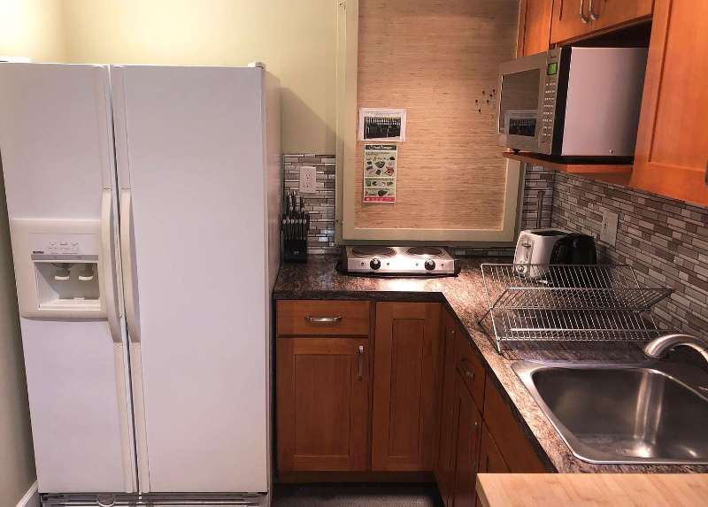 Property Id: 778314 Beautiful fully furnished daylight basement unit in lower half of mid-century home. Clean, quiet space with private entrance on ground level at back of house. Max occupancy 5 people. Utilities/wifi included in rent. Off street parking available. One bedroom with queen size bed, second room furnished as office, updated bath with full tile shower, living room with dinette. Kitchen includes full size fridge, microwave, 2 burner hotplate (no stove/oven).