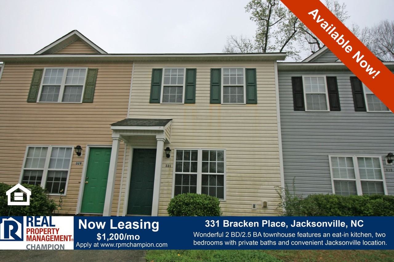This wonderful 2 BD/2.5 BA townhome is ready for you to call it home. The main level features a spacious living room with ceiling fan for your comfort and a large window to take advantage of the natural light. The eat-in kitchen offers ample cabinets, a see-through to the living room, a laundry closet, ready for your own washer and dryer, and access to the back patio which includes a storage closet. The refrigerator, range and dishwasher are included. A coat closet and half bath complete the main level. Upstairs you will two bedrooms, each with a private bathroom. This home is located in the Acorn Forest community, convenient to shopping, dining, hospital, public library, Camp Lejeune and area beaches. Schedule a Showing: https showmojo com l 3b5d64f006 331-bracken-place-jacksonville-nc-28540?g=1 Virtual Tour: https my matterport com show ?m=58R22dQr36F We are an Equal Housing Opportunity Management Company and abide by the term of the Federal Fair Housing Act. 1 Pet under 35 lbs allowed with prior approval and required pet fees. Aggressive breed list may apply. Contact listing agent prior to submitting application. No Smoking, e-cigarettes or vaping. All applicants over 18 years of age are subject to a background check, including criminal, credit, employment verification, and past tenancy.