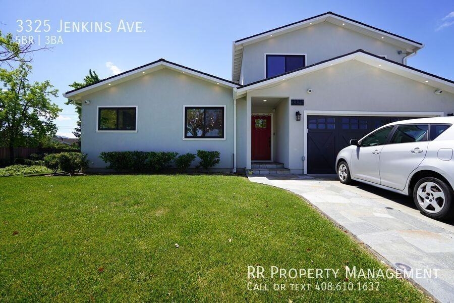 Wow, this home is a 10! Extensively remodeled and expanded, this 5-bedroom, 3-bath home is spacious and luxurious. Open floor plan with an expansive kitchen and dining area including custom cabinetry, quartz counters, stainless steel appliances, a large island, and skylight. Living room and family room complete with engineered hardwood flooring and views of the backyard. Ground floor bedroom, perfect for use as an office or guest room, adjacent to the ground floor full bathroom. Upstairs leads to a light-filled second floor featuring 4 additional bedrooms including a spacious primary suite, complete with a large walk-in closet, and bathroom with step-shower and custom tile work. All bedrooms feature luxury plush carpeting and closets with built-in organizers. Large backyard with fully fenced yard, lawn area, and patio. Attached 2-car garage features epoxy flooring, built-in cabinets for extra storage, and washer/dryer. Central AC and heating. Excellent location with great schools nearby including top rated private schools like Valley Christian, Stratford, and Challenger! Close to shopping, parks, hiking, and easy access to freeways 85 and 87! Garbage and landscape maintenance included. 18-month lease desired. No pets. No smoking. Application fee $25 per adult. 2 Car Attached Garage Closet Organizer Custom Cabinetry Custom Tile Showers Dual Pane Windows Engineered Wood Flooring Epoxy Garage Flooring Gas Range Great Room Ground Floor Bathroom Ground Floor Bedroom Quartz Counters Recessed Lighting Remodeled Bathrooms Remodeled Kitchen Skylight Tile Flooring