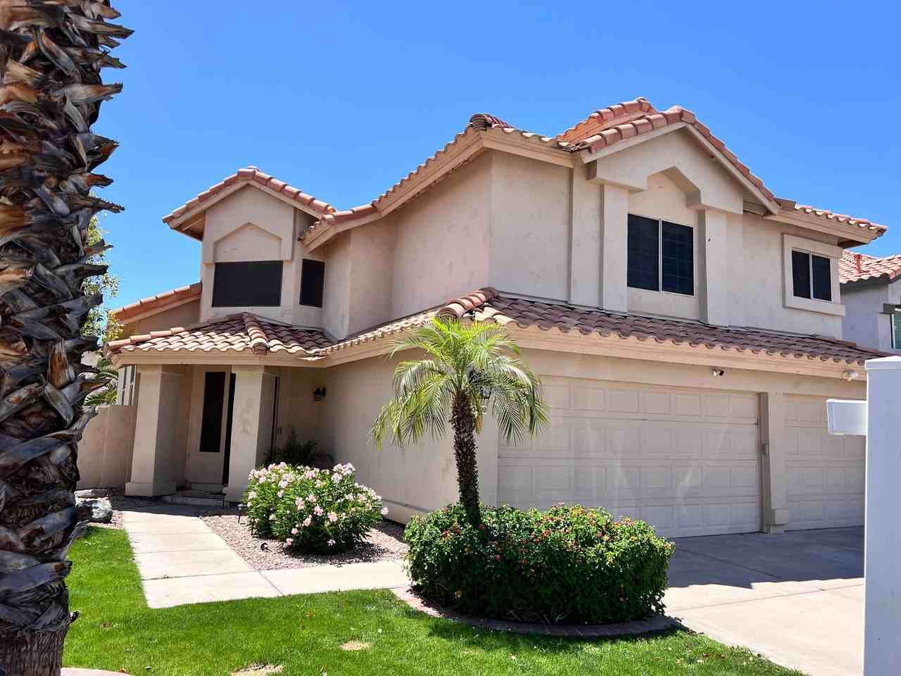 This 2 story features the living space downstairs and the bedrooms upstairs. Vaulted ceilings when you walk in, neutral tones throughout. The kitchen boasts white cabinetry, stylish tile backsplash, granite counters, stainless steel appliances, recessed lighting, a pantry and a breakfast bar style peninsula. The huge main bedroom has carpet in all the right places, plantation shutters, a private bathroom with a separate soaker tub and shower, dual vanities & large walk-in closet with shelves/racks. 2 large upstairs guest bedrooms each have walk in closets. The backyard is fabulous including a fenced swimming pool (weekly pool service included) covered patio and grassy lawn area. 3 car garage! The washer/dryer are as-is only (landlord does not offer repairs/replacement on washer/dryer)