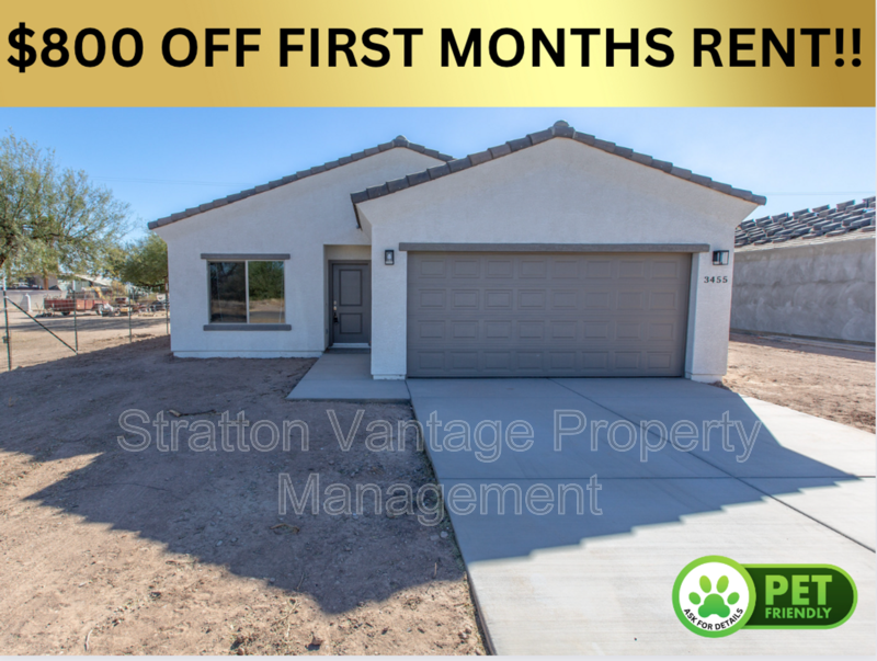 https my matterport com show ?m=UyHsgmKyVFt $800 OFF FIRST MONTHS RENT!! Don't miss this BRAND NEW 3 bedroom, 2 bath home now available in Eloy! Beautiful open floor plan with great room, wood-look plank tile flooring. White Kitchen with peninsula, quartz tops, upgraded cabinets, SS appliances including refrigerator, large pantry with plenty of storage. Generous sized Primary suite with ensuite bath. Covered patio in spacious backyard. Quality built home with 2x6 construction, energy efficient spray foam insulation, raised panel interior doors, upgraded hardware, fans and light fixtures included. No HOA. Bring the RV and all the toys. Great value! Schedule your showing TODAY! *BEWARE OF SCAMS! We do not list our homes on or Facebook Marketplace. Please contact Stratton Vantage Property Management to confirm availability and rent price* INITIAL MOVE-IN COSTS Security-Deposit - minimum is 1.25X monthly rent but not greater than 1.5X the monthly rent. (75% may be refundable) First Month Rent + 3% Processing Fee + Rental Tax where applicable + $75 Resident Benefit Package Setup Fee Lease Preparation Fee: $225 *Pets - If Applicable, a minimum Non-Refundable Pet Fee in the amount of $250 per pet is required - (Some Breed Restrictions Apply) – Does Not Apply to Assistive Animals *Pets - If Applicable, the First Month of Pet Rent in the amount of $60-$80 per pet depending on type of pet(s) which includes a $30 pet administrative fee – (Some Breed Restrictions Apply) - Does Not apply to Assistive Animals RECURRING MONTHLY COSTS Rent + 3% Processing Fee + Rental Tax (where applicable) $75 Resident Benefit Package - (includes renters’ insurance, credit reporting, rewards program and more) *Pet(s) – If Applicable, $60-$80 per pet, which includes a $30 pet administrative fee – Does Not apply to Assistive Animals *TO VIEW PROPERTY AT YOUR CONVENIENCE FOUR EIGHT ZERO FIVE FIVE THREE EIGHT ZERO NINE FOUR 480-553-8094 *BEFORE YOU APPLY TO RENT THIS PROPERTY, PLEASE VISIT OUR WEBSITE TO REVIEW OUR RENTAL QUALIFICATIONS AND LEGAL DISCLOSURES WWW STRATTONVANTAGE COM ADDITIONAL DISCLOSURES Brewer & Stratton Property Management LLC is an Arizona Limited Liability Company dba Stratton Vantage Property Management. 12-month minimum lease term, (longer lease terms may be negotiated). Stratton Vantage Property Management does business in accordance with the Fair Housing Act. Stratton Vantage Property Management does not discriminate against any person based on race, color, religion, sex, handicap, familial status, or national origin. The information contained in this ad is accurate to the best of our knowledge. Stratton Vantage Property Management is not responsible for any error or omission in the wording or content of this information. Amenities: FRIDGE, RANGE/OVEN, MICROWAVE, DISHWASHER, WASHER, DRYER