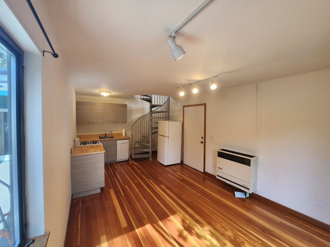 Enjoy this cute two story studio apartment nestled in with tall tress and backs up to a creek. The unit has solid wood floors, updated kitchen, fresh paint, and track lighting. Take the spiral stair case to your bedroom with vaulted ceilings, full size closet and full size bathroom. Enjoy a wood deck off the primary bedroom with views of the tress and creek. All utilities are included except wifi. Sorry no pets or smoking is allowed. Note: Utilities $200 per month. Washer and Dryer on site for $50 more per month