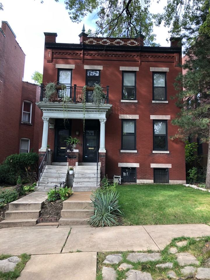 Located less than a block from picturesque Tower Grove Park sits this red brick beauty! One of the last multi-family houses on the tree-lined street.1500 sq feet of 10' ceilings await you in this 2-bedroom 1 bath home. The large front door leads you into the foyer featuring the original chandelier and stained-glass window adorned stairway. The second-floor unit features hard wood floors, classic wood trim, crown molding, and two decorative fireplaces. The living room and spacious dining room provide ample space for entertainment. Each room features multiple lighting options, including dimmer switches. If you prefer natural lighting, this unit is for you as it features three skylights! Your devices will never be low on battery power with the overabundance of outlets in each room. The massive 18x12 primary bedroom boasts his and hers closets and even more natural light through an oversized window. The second bedroom is carpeted (it was formerly used as a nursery) and the unit has a bonus front room, perfect for a home office. Off the front room through a set of French doors is the front balcony, perfect for enjoying a nice autumn or spring evening. Brand-new fridge, dishwasher, and range await you in the eat-in kitchen. Just off the kitchen sits the newly remodeled, partially covered deck complete with a ceiling fan and light. This unit also features something very rarely seen- central AC, forced air heat, AND radiant heat! High efficiency washer and dryer units are available in the basement. A six-foot privacy fence lines the perimeter of the well-lit, tastefully landscaped, inviting back yard. Off-street parking in a secure garage available complete with a level 2 EV CHARGER. A short walk to South Grand restaurants, shops, and bars. With easy access to midtown, downtown, I-64, and I-44 this home is ideally located. Barnes-Jewish, St. Louis Children's, SLU, and Cardinal Glennon hospitals- as well as Siteman Cancer Center are all within 3 miles. Owners are very attentive. Move-n date flexible, inquire for further details. The owner pays for water and sewer, all other utilities responsibility of renter. Lease terms are at least one year, up to two-year leases available. An application fee of $40 will be collected for background and credit check. This is a non-smoking building.