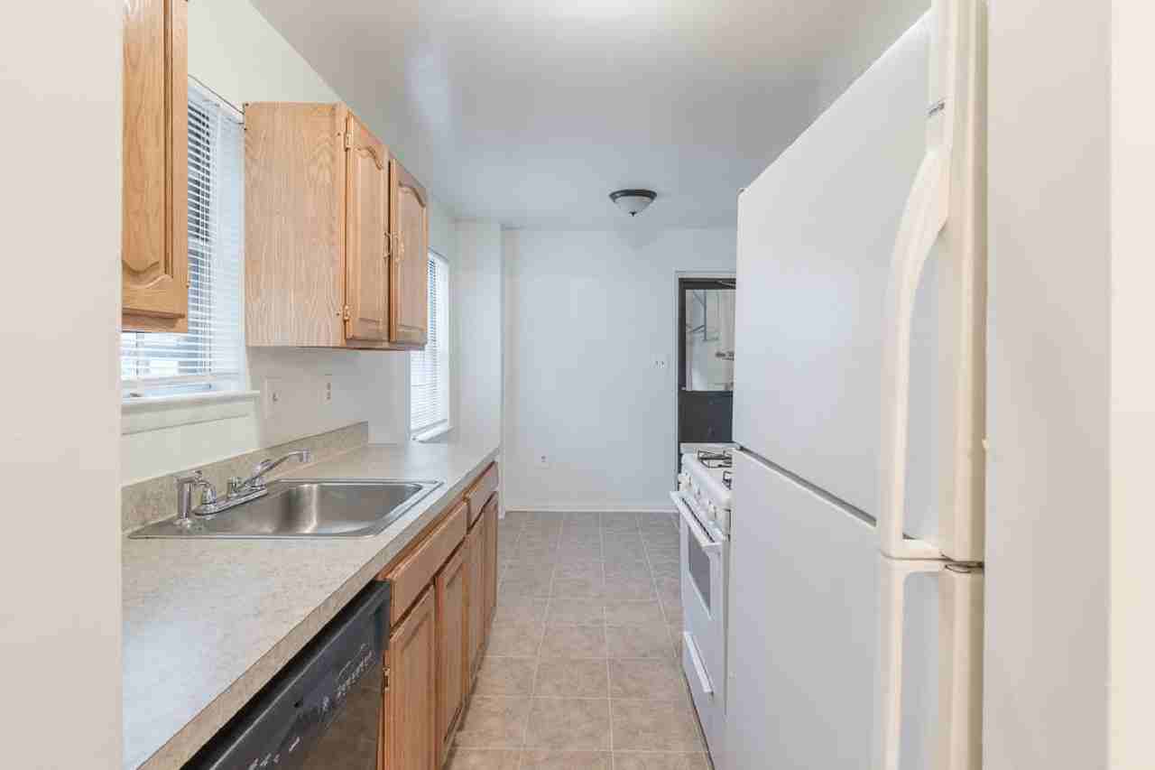 Cozy living room and dining area flow effortlessly together. Galley-style kitchen with hardwood cabinets and room for a breakfast nook.