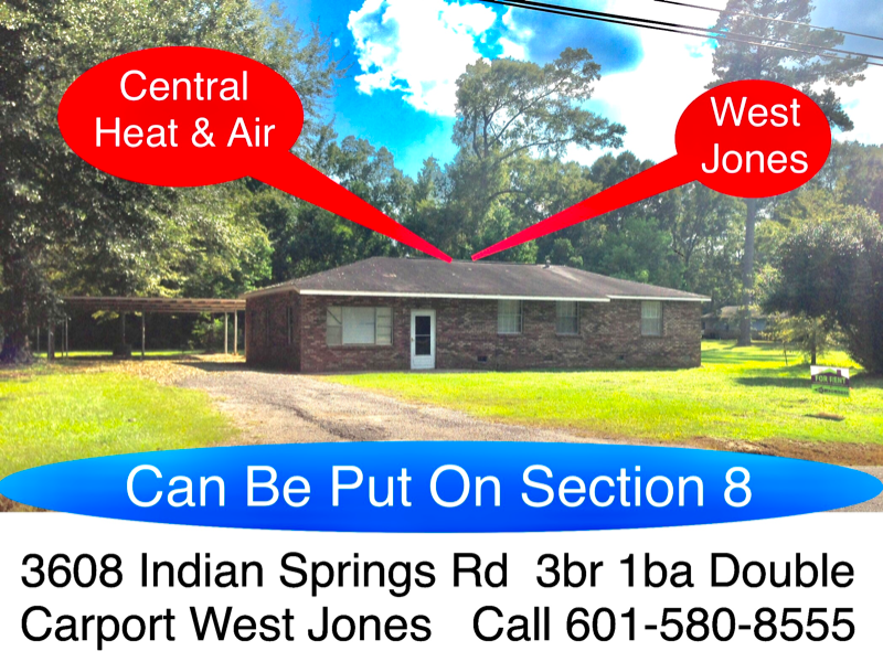 Property Id: 869748 3608 Indian Springs Rd, 4 Bedroom 1 Bath, Central Heat and Air, Stove and Refrigerator, Double Carport, West Jones Schools, Parker McCurley Properties, LLC Call 601-580-8555 for details