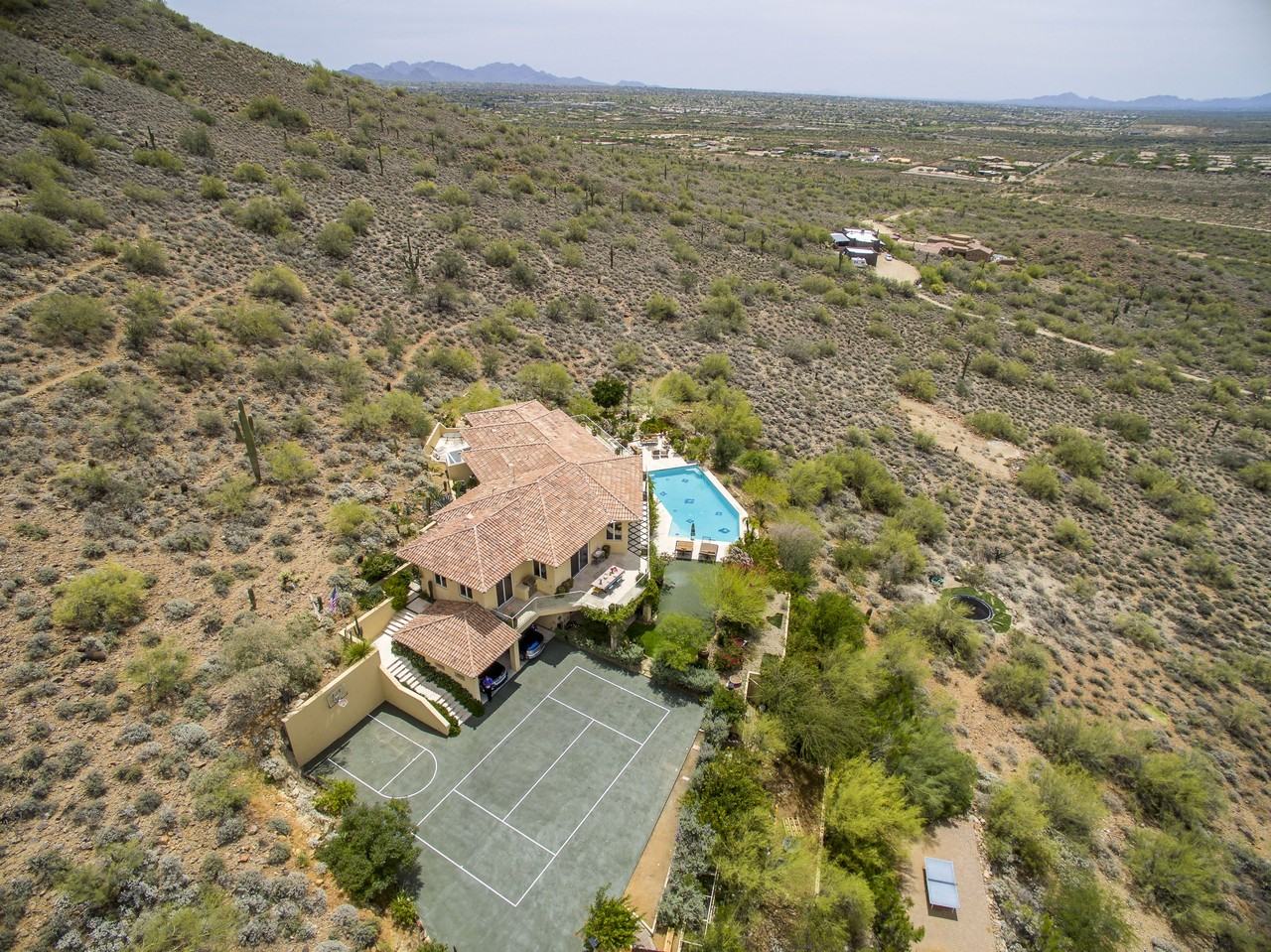 Voted best on tour, this home has VIEWS! Interior offers chefs kitchen w/ 2 ovens, 2 dishwashers, wine cooler, and many group dining options. Master on main w/ walk-through shower to sauna & hot tub in private patio. Large office. 3 bedrooms & workout room downstairs. 2 Washers/Dryers, upstairs & downstairs. Views from every window. Outside backs onto Cave Creek Regional Park w/ incredible views from Anthem to Pinnacle Peak. 18 outdoor tee boxes, putting green, game court, infinity pool, 2 grilling areas on upper & lower area, many areas for lounging, playing & entertaining in professionally landscaped gardens. Surround sound inside & outside. 2 covered patios & room for 8 cars. Hiking/biking trails. A private 5 acre playground. Lease length/terms negotiable. Yard Maintenance Included.