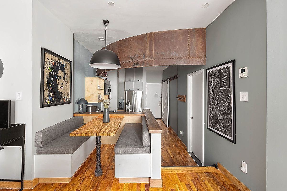 Welcome to 37 Bridge Street, 3G, a sleek and sophisticated one-bedroom (flex 2BR) with a den. The 10-foot ceilings, solid hardwood oak flooring, custom windows, reclaimed wood, and restored silo accents create a unique, stylish setting. The living room features sliding glass doors that open to a charming Juliet balcony. The primary bedroom boasts ample closet space and a southern-facing window that floods the room with natural light. The spacious den, currently used as a second bedroom, can also serve as a home office. The custom-designed kitchen showcases Baltic birch wood detailing, matte gray counters and cabinetry, a Bosch dishwasher, and a Bertazzoni range. The recently renovated bathroom has radiant heated floors programmable on timer, heated towel bars and toilet seat with bidet and anti fog vanity mirror. The unit includes central AC, a vented washer/dryer and comes with a private storage unit. Kirkman Lofts, originally a 1915 soap factory, was converted in 2012. Preserved elements feature railroad tracks and cobblestone floors in the lobby, original steel silo accents, and reclaimed woods in the homes. Amenities include a virtual doorman, gym, bike room, package room, and cold storage. There are also two outdoor terraces on the 5th floor and roof, with incredible views, grills and furniture. The building, located on a quiet block east of the Manhattan Bridge, is just three blocks from the F train at York Street. Other subway lines nearby include the A/C at High Street and the 2/3 at Clark Street. Brooklyn Bridge Park, the waterfront, Empire Stores, Time Out Market, DUMBO House, restaurants and shops and fitness options (Equinox, Lifetime, etc.) are all within close proximity to Kirkman Lofts.