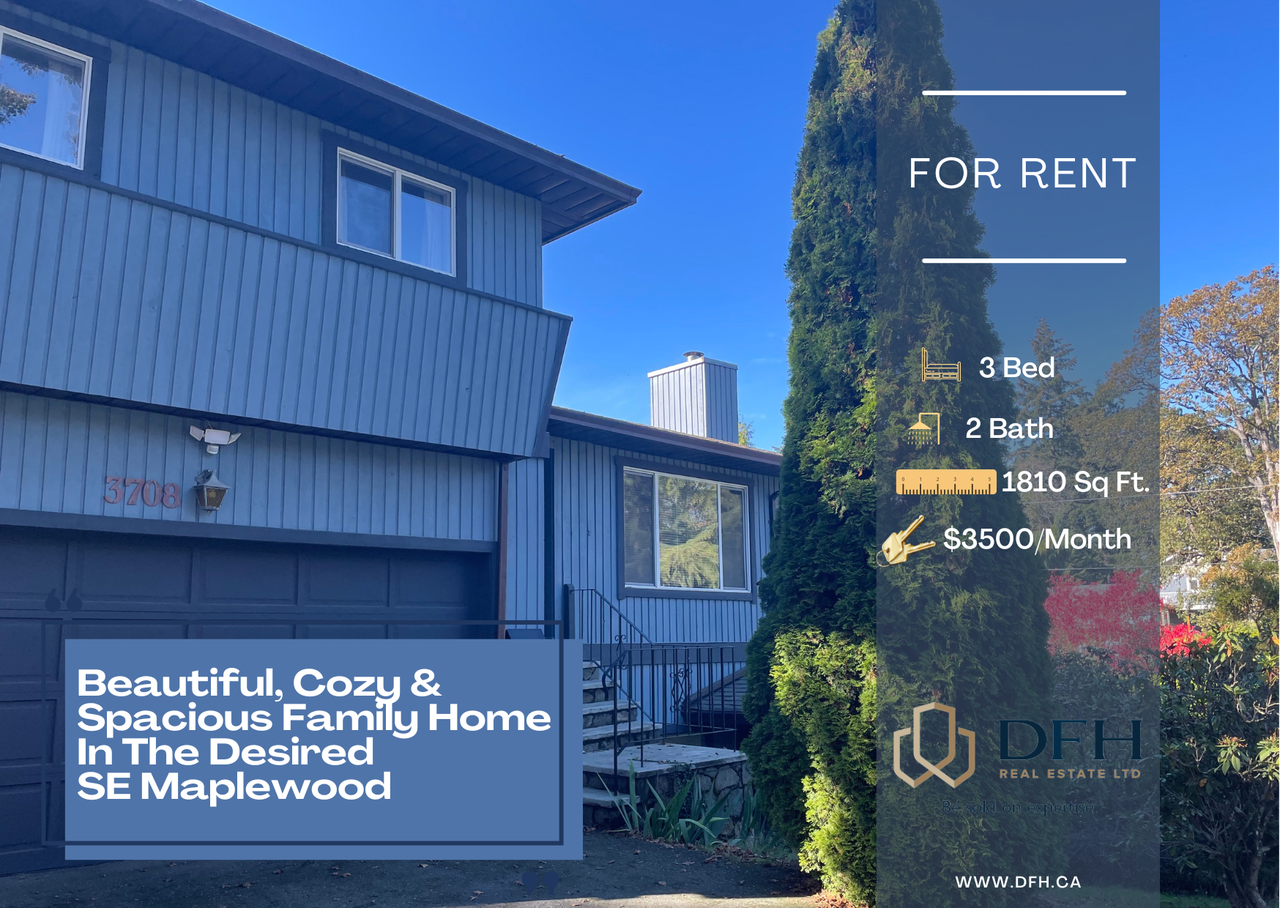 We are excited to announce that we have a new property available to rent! Located in the beautiful and idyllic Maplewood area of Saanich East, this house has plenty to offer. The spacious living room has a wood burning fireplace which also lends a nice, cosy feel for when the winter months soon arrive. The kitchen comes with new appliances and looks out at the beautiful, private back yard and big deck. There is also a games room by the kitchen and a sauna, perfect for decompressing after those long days at the office. Upstairs contains the bedrooms that are all a good size and bright. The property also has a garage and driveway where you can fit at least two vehicles. Get in touch with us today for a showing before this house gets snapped up! DFH REAL ESTATE LTD.