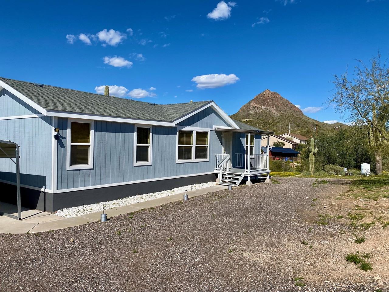 Well-maintained manufactured home on 2-plus acres in New River. There is plenty of room to spread out with a high four-stall carport, 2 shops, and 2 additional outbuildings. Enjoy carefree living with beautiful views of Gavilan Peak out your back door.