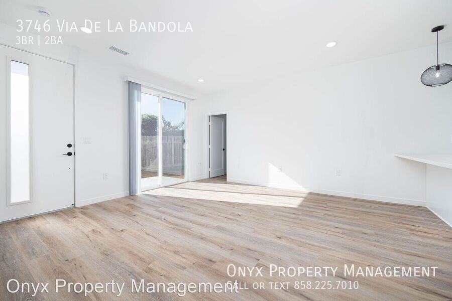 ****Move-In SPECIAL! Half Off 1st Month's Rent**** 3746 Via De La Bandola San Diego CA 92173 3 Bedrooms, 2 Baths $3,095 per Month $3,000 Deposit Remodeled/Gorgeous 3 bedroom 2 bath, brand new kitchen with new quartz countertops, new appliances, lots of natural lighting, vinyl plank flooring, new paint, new ceiling fans and lighting fixtures, high vaulted ceilings, new cabinets and countertops in all bathrooms. Fenced backyard, 2 car garage, washer & dryer hookups, super easy freeway access to 5 /905 /805. Lease: 1 year Parking: 2 car tandem parking spots Available: December 17, 2024 Pets: No Pets Utilities: Tenants pay all Utilities, Water/ Sewer is based on number of occupants Appliances: Range/Oven, Refrigerator, Dishwasher, Microwave Yard: Private backyard Close to Chula Vista, Otay Mesa, National City, Imperial Beach To schedule a viewing, please visit: www OnyxPropertyManager com or call 858-225-7010 Onyx Property Management tel: 858-273-8800 Cal BRE#01317589 Rental Rates and Terms Are Subject To Change Without Notice