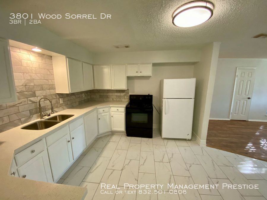 Completely Remodeled must see 3 bedroom 2 bathroom home in Dickinson. Fresh Paint throughout the house. Updated kitchen with Quartz countertops and new tile. Master bedroom is good in size with updated bathroom attached. Walk in shower with off white backsplash and quartz countertops on the sink. Mid sized backyard fenced with charming deck for entertaining. No backyard neighbors and backs up to Barber Elementary School. Come see your new home today!