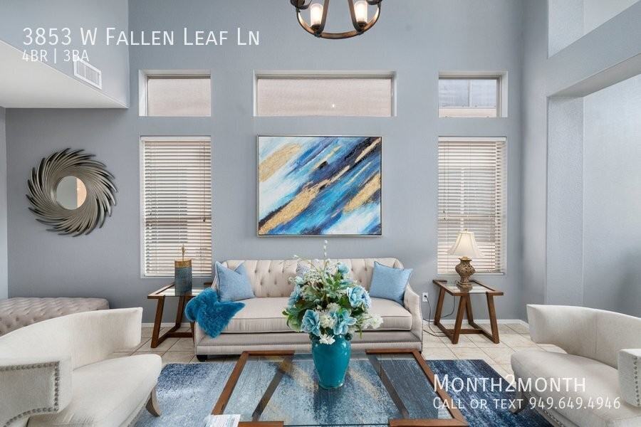 Welcome to this beautiful detached villa located in the peaceful North Canyon Ranch neighborhood on W Fallen Leaf Ln. This artsy home has been fully furnished and decorated by a designer, providing a comfortable and stylish living space for you and your family. Upon entering, you'll be greeted by a newly renovated kitchen featuring a central island and a sleek, smooth-moving design. Whether you're making a morning coffee for your loved ones or cooking a delicious dinner with your family, this kitchen is fully equipped to meet your needs. After dinner, relax on the sofa with your family or challenge your friends to a game of pool on the latest pool table provided. The four spacious and comfortable bedrooms are large enough to accommodate your family, and all the daily necessities you may need are ready for your arrival. The brand new bathrooms and modern appliances, including a fridge and oven, make your stay even more comfortable.