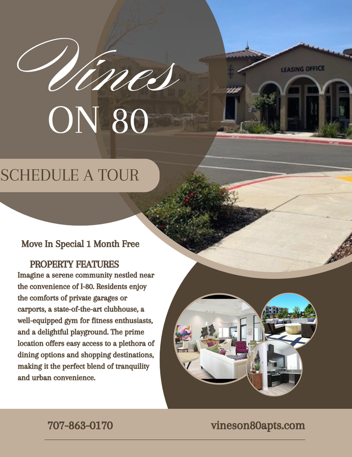 Vines on 80 is your connection to a higher standard of living. Our premier location in Fairfield, California, is favorably located near Solano Community College. Choose from spacious and stylish, one, two, and three bedroom apartments equipped with all the contemporary comforts you've been looking for. The pet-friendly community boasts a few modern extras like a fitness center with cardio and weight-training equipment as well as an outdoor lounge.