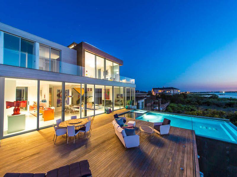 Also Available Year-Round for $1,000,000Recently completed, this striking new-build modern residence with 309+/- of direct waterfront and dock on 2.4+/- acres, offers 360-degree bay and ocean views, stunningly so from its top floor deck. Noted NYC architect designed the residence blending a striking, light-filled floor plan with walls of thick glass, and industrial elements like floating staircases with exposed iron supports. The gathering spaces on the main floor include the living room with fireplace, open dining, and ultra-modern kitchen, all that face a wall of floor-to-ceiling glass windows that open onto the rear deck and heated infinity-edge Gunite pool. A guest suite, laundry room, convertible den/guest room, and bath complete this floor. The second floor offers the bay-facing master suite and gleaming master bath, two guest suites and exercise room. Up another staircase, the roof deck offers those 360-degree views as if hovering over the ocean and bay. The lower level, at grade, accesses the two-car garage, and an elevator connects to the main floor. Extraordinary home in a brilliant location, walkway and dock were just completed. Memorial Day - Labor Day - $800,000; August - Labor Day - $400,000; Year-Round - $83,333 Per Month