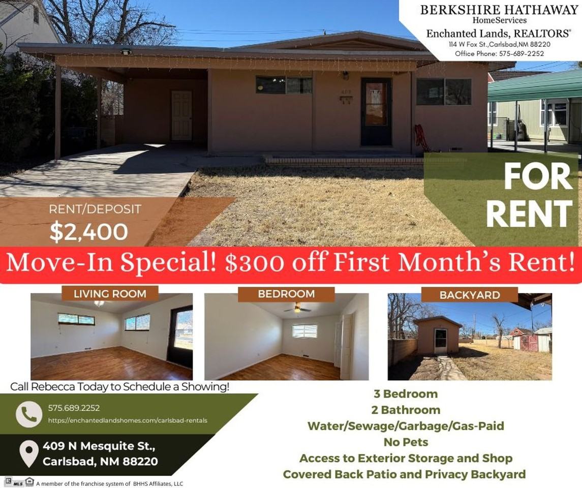Move-In Special, $300 Off First Month's Rent! 3 Bedrooms 2 Bathrooms Eat-In-Kitchen Large Detached Laundry Room Under Carport Exterior Shop & Storage Covered Back Patio & Privacy Fenced Back Yard NO PETS!!! Call Rebecca at 575-689-2252 to schedule a showing, applications available at EnchantedLandsHomes. com Carlsbad-Rentals