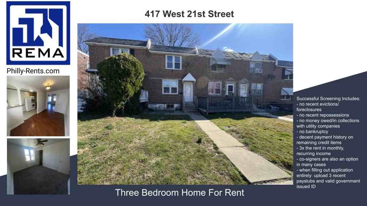 Virtual Tour: https my matterport com show ?m=13Bz5G27QNi Brand New Renovation 3 bedrooms 1 full bathroom Modern renovation Recently replaced carpet Carpet Rear parking space Fridge, Stove & Microwave Washer & Dryer HOOKUP Professionally managed with resident portal and online rent payments Move-in Ready! Three months’ rent to move in (including first, last, and security deposit) along with successful screening results. Successful Screening Includes: - no recent evictions/ foreclosures - no recent repossessions - no money owed/in collections with utility companies - no bankruptcy - decent payment history on remaining credit items - 3x the rent in monthly, recurring income - co-signers are also an option in many cases - when filling out application entirely: upload 3 recent paystubs and valid government issued ID REMA LLC Jenkintown, PA https www reinfo411 com rentals