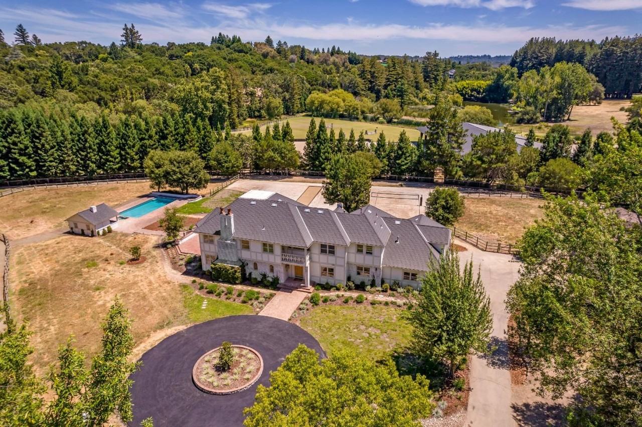 Experience country living on this exquisite 3-acre estate featuring a newly renovated, gorgeous English Tudor home. Tucked away at the end of a secluded, gated lane in Woodside, this home balances privacy and relaxation with fun activities for friends and family. The outdoor space, also newly renovated, features an inviting pool and spa, and under the separate pool house overhang, a kitchen area with BBQ. A lawn area, bocce court, and a sand volleyball court are set within lush, tree-lined fencing. Enjoy easy access to the extensive hiking or riding trails in Wunderlich Park. Equestrians will find a well-appointed barn with turnouts and an eclosed paddock. Inside, the home showcases modern elegance with generous living spaces. The main floor includes a formal living and dining area, an expansive family room, and a library. This floor also features a bedroom with an en-suite bath. The upper level offers a luxurious primary suite, three additional bedrooms, and a versatile office space that can be converted into another bedroom. The property also includes a 4 car-garage and ample driveway space. Portola Valley Schools.