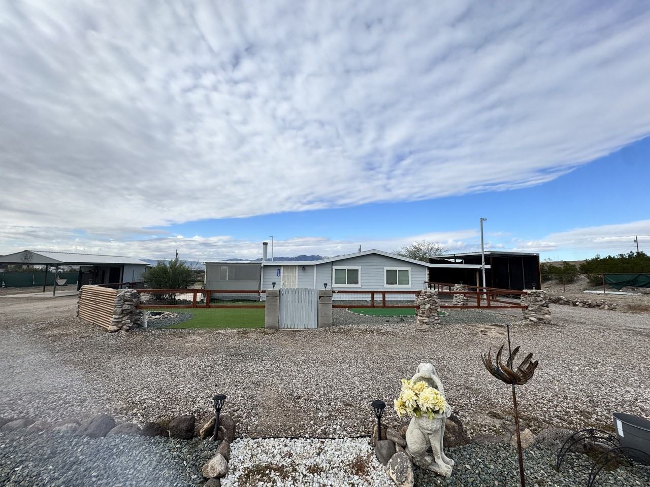 Enjoy space, privacy, and versatility with this charming 2-bedroom, 2-bath main residence plus a separate guest house, all situated on spacious acreage. Perfect for those seeking a rural lifestyle with room to spread out. The main home features a warm, inviting interior with a functional layout, generous living spaces, and comfortable bedrooms. Natural light flows throughout, and thoughtful finishes create a cozy yet practical environment for everyday living. The detached guest house serves as a third bedroom and includes a small kitchenette, making it ideal for extended family, guests, a private office, or additional living space. Outside, the property offers wide-open views and ample outdoor space, perfect for enjoying the desert landscape, animals, toys, or equipment. Additional acreage may be available for rent at an additional cost, offering even more flexibility for those needing extra land.