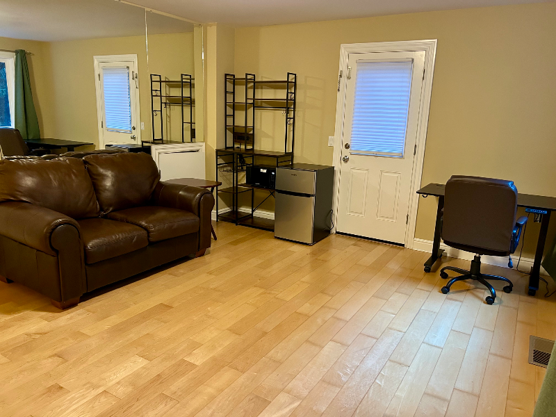 Property Id: 2302501 This is a large private room with private deck and entrance (237 square feet) on the lower level of the house. Includes bathroom and laundry room shared with one other female housemate. Does *not* include use of the living room or kitchen. Walk-in closet with clothing storage drawers. Large window with beautiful forest views. Mostly furnished except you bring your own bed. Includes: couch, kitchenette with microwave and mini fridge, desk and chair, two small tables. Private storage nook. Share a large bathroom with one other female housemate (extra large tub and separate shower). Share a laundry room with one other female housemate, includes large sink. Wood floors and one mirrored wall. Use only unscented products as the house is entirely fragrance-free. Looking for female housemate only. No guests or pets.