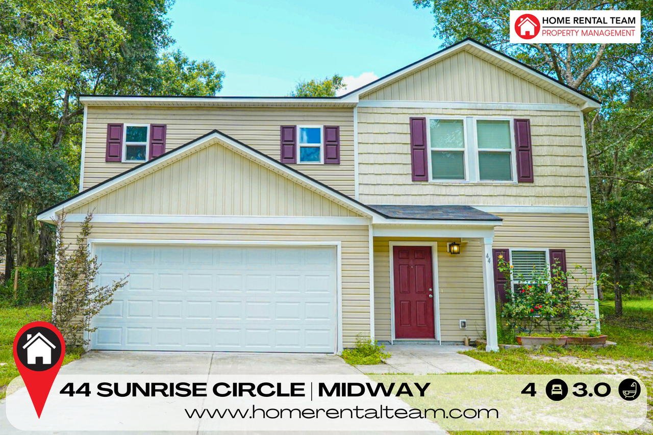 Welcome to 44 Sunrise Circle, a stylish 4-bedroom, 3-bath home located in the peaceful Anglers Edge community of Midway. The main floor features an open-concept layout that connects the dining area, kitchen, and great room, creating a bright and inviting space for everyday living. The kitchen is equipped with stainless steel appliances, a pantry, and ample cabinetry, making it both functional and welcoming. A full bedroom and bath on the main level provide flexibility for guests. Upstairs, the primary suite includes a private bath with double vanities and a walk-in closet, while two additional bedrooms share a full bath. A media loft adds extra space for entertainment or work-from-home needs. Additional highlight include a two-car garage. Located just minutes from I-95 and Fort Stewart, this home offers a quiet setting with easy access to schools, shopping, and coastal recreation. Pets upon homeowner approval.