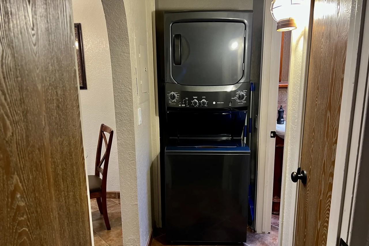 This is a fully furnished one bedroom, everything is new. Tile/Hardwood flooring, 65" flat screen smart TV in living room with 50" in bedroom. Direct TV with movie channels and Apple plus. High speed Broadband wireless internet and Two Alexa Echo dot controllers for voice commands for lights, Tv's. Unit has AC, and covered parking. Fenced in and furry creatures are welcome. New full size Washer and Dryer, New King Bamboo mattress (made from anti-microbial and antibacterial properties for those with Allergies) Finest quality sheets and linen available. Stocked with bottled water and K cup coffee refills during your stay. Dishwasher and microwave, and glass top stove. In room office center with scan/copy/fax for your office needs.