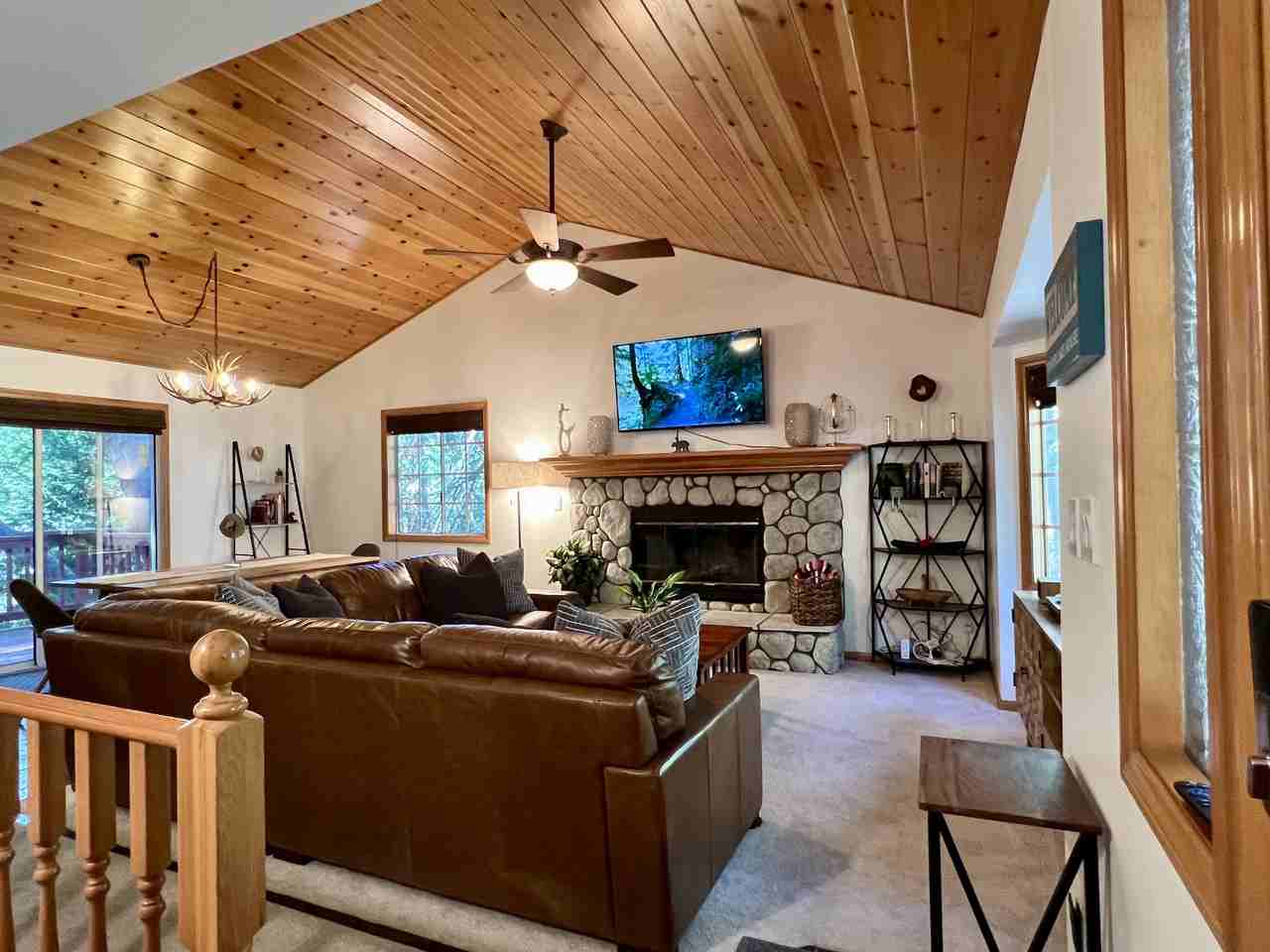 This spacious and serene mountain home is waiting for you to come relax and enjoy. The level-entry home, which makes a big difference in the snow, is in a nice, quiet neighborhood on a flat, maintained cul-de-sac street. Road is plowed by County. Spacious two car garage with room for three additional cars to park on the adjacent parking deck and driveway apron. Feel like you are literally in a treehouse as you look out to mature trees surrounding the home. Open one of many windows to smell the mature pine and fir trees and listen to the bubbling brook that runs year-round along the canyon floor. Follow Orchard Creek at the bottom of the canyon to the Lake for ALA access to the walking trails. Very well maintained and recently refurbished 2,162 sq. ft. home is available fully furnished with newer furniture. The beautiful tongue and groove 25-foot ceiling gives a warm and roomy feel to the living and dining room. Many large windows throughout the home bring the outdoors in and provide lots of natural light throughout. The lovely stone wood-burning fireplace and leather sectional in the living room will make you want to curl up and enjoy the 55 inch HD TV. The dining room looks out over the wrap-around deck and looks down to Orchard Creek and up to gorgeous mature trees. Stainless steel BBQ and new patio dining furniture on the first-floor deck provides ample outdoor space to breath and enjoy. There is also a cozy enclosed garden space with hammock under the fir and maple trees provides additional idyllic space. Perfect area for pet relief or quiet solitude under a tree canopy. The whole house has lots of storage with plenty in the kitchen, including a huge pantry and oak cupboards. Stainless steel appliances including gas range, microwave and convection toaster oven allow you to cook or bake to your hearts desire. Level garage entry and half bath conveniently located right off the kitchen. The two car garage is clean and could be used as a bonus room, workout room or workshop. Parking deck and driveway apron can accommodate up to three additional cars off the street. The home is well appointed for your every comfort. On the second story are two full spacious bathrooms and three bedrooms with hardwood engineered flooring throughout and rugs so your feet aren't cold. All bedrooms have ceiling fans to ensure your perfect temperature. Two large bedrooms have king beds and lots of closet space. The master suite has an attached full bath and a slider out to a small intimate balcony. The smallest bedroom has a twin over full bunk beds with a large mirrored closet. Laundry facilities with washer and dryer are conveniently located between the bedrooms so no need to haul laundry up or down the stairs. The bottom third-floor is the place to gather for work or fun. The office has built-ins galore with a desk, sliding keyboard tray, filing cabinet, storage, and recessed lighting. A perfect space to conveniently work remotely while gazing out into the forest. Plenty of space for PlayStation 4 gaming on the recliners- playing a board game- or putting a puzzle together. High Speed internet throughout the home. The gaming room can be used as a fourth bedroom with its large closet and spacious full bath. An inflatable queen size air mattress is available for last-minute guests. Home is available for month-to-month rentals or a year-long lease at $3,500 a month. The home has exterior security cameras at the front door and parking areas. Small dogs are all..