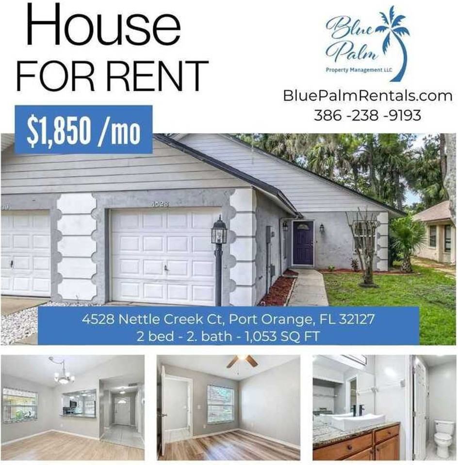 Charming 2 Bed, 2 Bath Home with Screened Lanai & Garage! This updated home boasts spacious rooms perfect for comfortable living, new flooring, and fresh paint. Step into the heart of the home an updated and beautiful kitchen that has ample storage space. Natural light flows through the home. There is a dedicated laundry space with washer & dryer. Enjoy the Florida breeze in the screened-in lanai, ideal for relaxing or entertaining guests. Park your car with ease in the convenient garage space. Professional lawn care is included. All utilities are tenant responsibility. Annual lease. No Smoking/No Pets. 1 month's rent & security deposit equal to 1 month's rent required to move in. Background/credit check required. All Blue Palm Property Management residents are enrolled in the Resident Benefits Package (RBP) for $50.00/month which includes liability insurance, credit building to help boost the resident’s credit score with timely rent payments, up to $1M Identity Theft Protection, HVAC air filter delivery (for applicable properties), move-in concierge service making utility connection and home service setup a breeze during your move-in, our best-in-class resident rewards program, on-demand pest control, and much more! More details upon application. Sugar Mill Elementary School Grades: PK-5Distance: 1.4 mi Silver Sands Middle School Grades: 6-8Distance: 1.2 mi Spruce Creek High School Grades: 9-12Distance: 1.7 mi