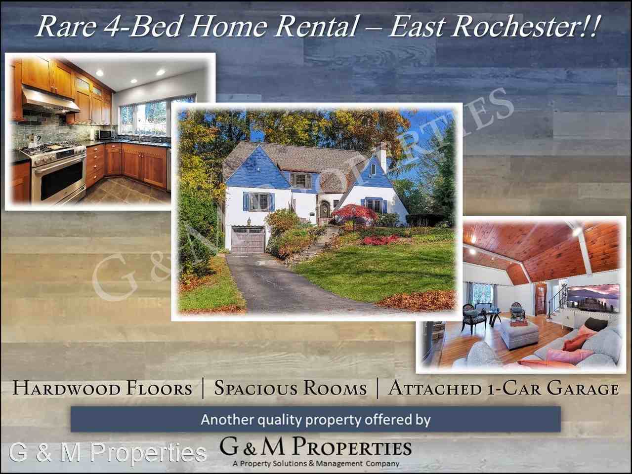 Rare 4-Bedroom Single-Family Home in East Rochester! - Drive into the unique Forest Hills neighborhood filled with storybook-like homes and see our charming English Tudor 4-bedroom home rental. Walk through the turret entryway with an arched doorway and check out the huge living room. You have a knotty pine plank ceiling, beautiful hardwood floors, and a stone wood-burning fireplace. In the kitchen, you have gorgeous cherry cabinetry, stainless steel appliances, soapstone countertops, and a slate backsplash. You have a huge master bedroom on the first floor and an updated full bathroom. Upstairs you have 3 more spacious bedrooms and a recently renovated 2nd full bathroom. Check out the large, private back patio: perfect for entertaining or just hanging out on a cool summer evening. The entire backyard is fully fenced in, with an access door / gate to East Ivy Street on the backside of the property, just across from the Edmund Lyon Park. You have an attached garage to keep the snow off your vehicle in the winter time. The basement is large and dry, perfect for all your storage needs. Here you'll find a washer and dryer as well, included for your convenience. Give us a call TODAY to schedule your walk-through of this fantastic home. This is yet another fine property that is professionally managed by G&M Properties. You'll love living in this fantastic single-family home, with all the conveniences this great neighborhood has to offer, combined with the great benefits that include 24-hour, 1-call maintenance and online rent payment. G&M Properties | (585) 568-7275 | www gmprop com Monthly Rent starting at $2,900. Please call for details. ----------------------------------------- **All G&M Properties residents are enrolled in the Resident Benefits Package (RBP) for $30.95/month which includes renters insurance, credit building to help boost your credit score with timely rent payments, $1M Identity Protection, move-in concierge service making utility connection and home service setup a breeze during your move-in, our best-in-class resident rewards program, and much more! More details upon application.** ----------------------------------------- **Dogs allowed [some restrictions may apply]. Additional Monthly Pet Fee required for dogs with completion of approved pet screening application** **NO Smoking** **Credit Check / Background Check Required** ----------------------------------------- No Cats Allowed