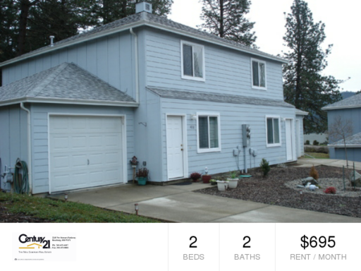 This is a two bedroom two bath townhouse duplex located in Sutherlin. The kitchen provides a range, fridge and dishwasher. The unit also offers a one car garage and washer/dryer hook-ups. There is gas heat and forced air cooling. The owner pays water, sewer and garbage. The tenant is responsible for gas, electric, phone, cable and internet. Photos may not be the exact unit, please use for layout purposes only. CENTURY 21 The Neil Company Real Estate 2245 NW Stewart Parkway Roseburg, Oregon 97471 Phone 541-673-4417 Toll Free 1-800-982-3497 Fax 541-673-8041 ALL UNITS ARE NON-SMOKING PLEASE DO NOT DISTURB THE CURRENT TENANTS ADDITIONAL DEPOSIT REQUIRED i.e. LACK OF RENTAL HISTORY OR CREDIT ISSUES. SEE OUR RENTAL LIST AND PHOTOS AT www.neilco.com OR E-MAIL US AT rentals@neilco.com PROPERTIES SUBJECT TO PRICE CHANGE, AVAILABILITY, OR WITHDRAWAL NO CASH OR CREDIT CARDS ACCEPTED