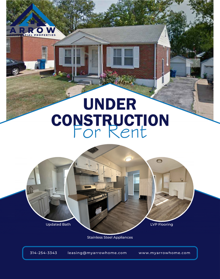 REHAB IN PROGRESS, MORE PICTURES COMING SOON! Pictures on the flyer are just to show what our standard cabinets, paint, and flooring look like. This single family home has hardwood floors throughout, spacious living room, kitchen, and generous sized bedrooms. Newly painted with new windows, updated kitchen and appliances. Located within walking distance to schools, bus routes, markets, shops and restaurants. Availability date is an estimated date. Application Fee: $40 per adult applicant (non-refundable) The application fee covers a comprehensive background check, which includes the following four areas: 1. Credit 2. Criminal 3. Employment/Wage Verification 4. Prior Rental History This fee ensures thorough evaluation to facilitate a smooth leasing process. Minimum Requirements: - Credit score of at least 575 - No felonies - Verifiable monthly income, 3 times the rent amount - Good standing rental history - No evictions or unlawful detainers within the past 5 years - No balance owed to previous landlord Total Cost to Move-In: - First month's full rent - Security deposit: 2x rent for credit scores between 575-599, 1x rent for credit scores above 600 - First month's sewer and trash (total $84) - Pet owners: First month's pet rent ($50 per pet) plus one-time pet fee of $250 per pet - Prorated rent, sewer, and trash charges will be charged the following month What's Needed Before You Receive Keys: - Signed lease - Utility Account Numbers (Gas, Electric, and Water) - Occupancy Permit - Renter's Insurance Declaration's Page with new address listed - Payment of all fees To secure the rental property, the approved applicant is required to place a deposit equivalent to one month's rent or the specified amount based on their credit application. Pets are welcome with a non-refundable pet fee. Resident is responsible for all utilities, including Gas, Electric, Water, Sewer, and Trash. These utilities are not included in the base rent pricing. Stoves and refrigerators will be provided in all homes. Don't miss out on this fantastic opportunity! Contact us today to schedule your showing and take the first step towards making this wonderful home yours. For further inquiries or to initiate the application process, please contact our Leasing Department at 314-254-3343 or visit our website at Arrow Residential Properties Website. Thank you for considering Arrow Residential Properties! We do NOT advertise our homes on or Facebook. Please beware of scammers!