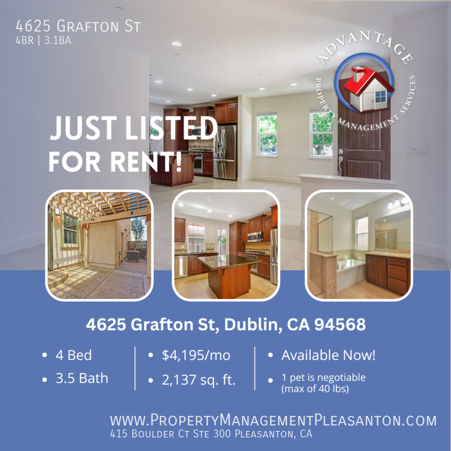 Schedule a Showing Online Experience a Virtual Tour by following this link: https my matterport com show ?m=snAU7DD5JjR Come to see this beautiful 4 bedroom, 3.5 bathroom, 2,137 sq. ft. home located off of Central Parkway near Fallon Sports Park. The home opens into a large living and dining room with tile floors and high ceilings. Next to the living/dining room is the gorgeous kitchen featuring stainless steel appliances, granite countertops, a large kitchen island and tons of storage space. The first floor also has a half bathroom. The second floor is fully carpeted and features a full hallway bathroom, separate laundry room and three bedrooms with the third bedroom having its own private bathroom with soaking tub and walk-in shower. The third floor is a spacious, private bedroom with its own bathroom featuring dual sinks, and a walk in closet. The property is complete with a well designed and very private patio space perfect for entertaining and a 2-car garage. The community offers access to a community pool, spa and fitness center. Available for move-in ASAP Rent: $4,195.00/month Security Deposit ranges from $5,245.00 - $8,390.00 unless you qualify for our zero security deposit option provided by Obligo. Applicants who meet all the Basic Criteria (http www advantagepms com rental-criteria ) are eligible for the minimum deposit. Applicants that do not meet all the Basic Criteria, but exceed the Minimum Criteria, may be approved with a higher security deposit. If you qualify for Obligo's service, you will not be required to pay a security deposit! Minimum Lease Term: 12 months Pet Policy: 1 pet max weight 40lbs is negotiable with a $500/pet security deposit increase and $30/month pet admin fee. Applicants with pets are required to submit a pet application through a third-party pet screening service at https apms petscreening com Renters Insurance: Required with $300,000.00 liability limit Refrigerator: Included Washer/Dryer: Included Gardening: Common Area is HOA maintained Parking: 2-Car Garage Utilities: Tenants are responsible for all utilities, except garbage Showings are available by appointment only. Schedule a showing online by clicking the Schedule a Showing link. The property is professionally managed by Advantage Property Management Services. Leasing Contact: Harrison Smith (DRE# 01902063) READ THIS IMPORTANT INFORMATION BEFORE YOU SCHEDULE A SHOWING Please review the Rental Criteria at http www advantagepms com rental-criteria before you submit a rental application. There is a $50/adult non-refundable application fee and ALL adults residing in the property must apply. We will (1) verify your identification; (2) check your credit report, unless you receive a Government Rent Subsidy and request to provide verifiable alternative evidence instead of a credit report no later than when the application is submitted; (3) verify your household income and employment, if applicable; and (4) verify your rental history with previous landlords. Most applications are processed in 2-3 business days from the date we receive a completed application and all supporting documentation. Security Deposits are calculated using a risk-based model. Applicants who meet all the Basic Criteria may be approved at the advertised security deposit amount. Applicants who do not meet the Basic Criteria but exceed the Minimum Criteria may be approved with a higher security deposit, not to exceed the legal maximum. We offer a security deposit-free op..