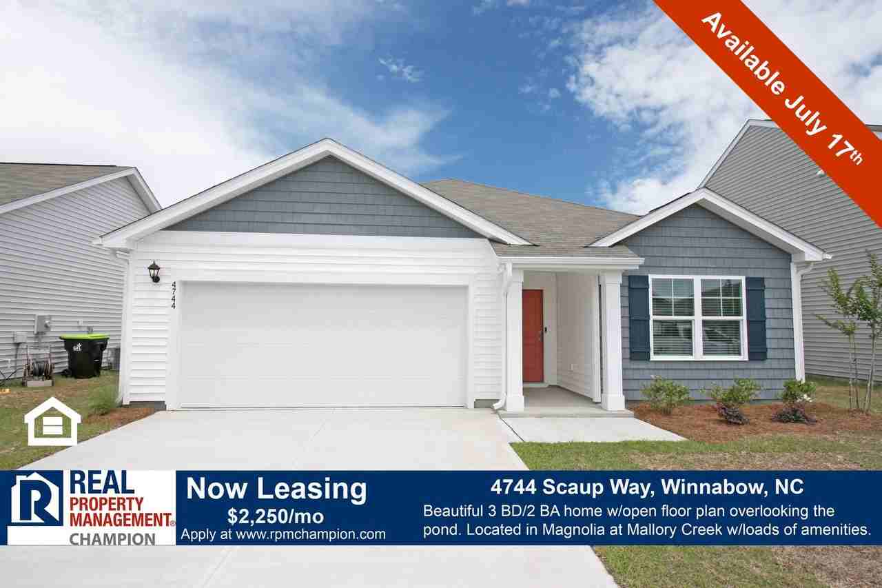This beautiful 3 BD/2 BA home features an open floor plan and sleek modern touches and views of the community pond. As you enter this new home you will find beautiful wood-like laminate flooring that extends from the foyer into the kitchen and main living area. Two guest rooms are located near the front of the house, and each offers cozy carpeting and generous closets. The hall bath has a tub/shower combination, single sink vanity with mirror and decorative light fixture. Moving toward the center of the home you will find a separate laundry room complete with washer and dryer and access to the attached two car garage. Continuing the tour, you will find the heart of the home with its open and spacious kitchen, dining and living areas. The kitchen features an island with breakfast bar and extra-large pantry. The stainless-steel range, dishwasher, built-in microwave, and side-by-side refrigerator are included with the home. The kitchen is open to the living room and dining area which has a sliding glass door to the covered back patio. The split bedroom layout allows privacy for the master bedroom which includes a walk-in closet and spacious private bath with double sink vanity, step-in shower and separate water closet. Don’t miss out on your chance to live in this new home and enjoy the abundant amenities within Magnolia at Mallory Creek including two community pools, walking trails and parks. Convenient to shopping and dining in both Leland and Wilmington. Schedule a Showing: https showmojo com 5ebd6c3076 listings mapsearch We are an Equal Housing Opportunity Management Company and abide by the term of the Federal Fair Housing Act. Up to two pets, up to 25 lbs allowed with prior approval and required pet fees. Aggressive breed list may apply. Contact listing agent prior to submitting application. No Smoking, e-cigarettes or vaping. All applicants over 18 years of age are subject to a background check, including criminal, credit, employment verification, and past tenancy.